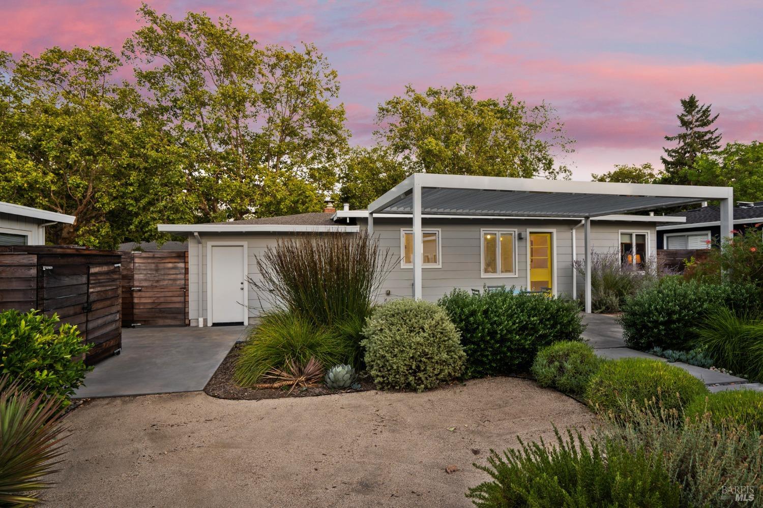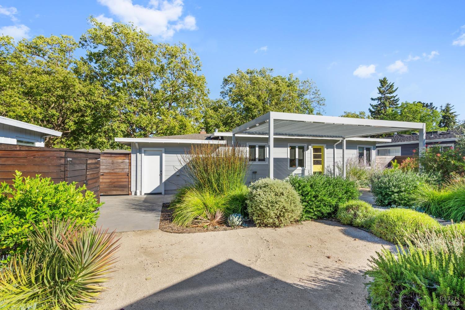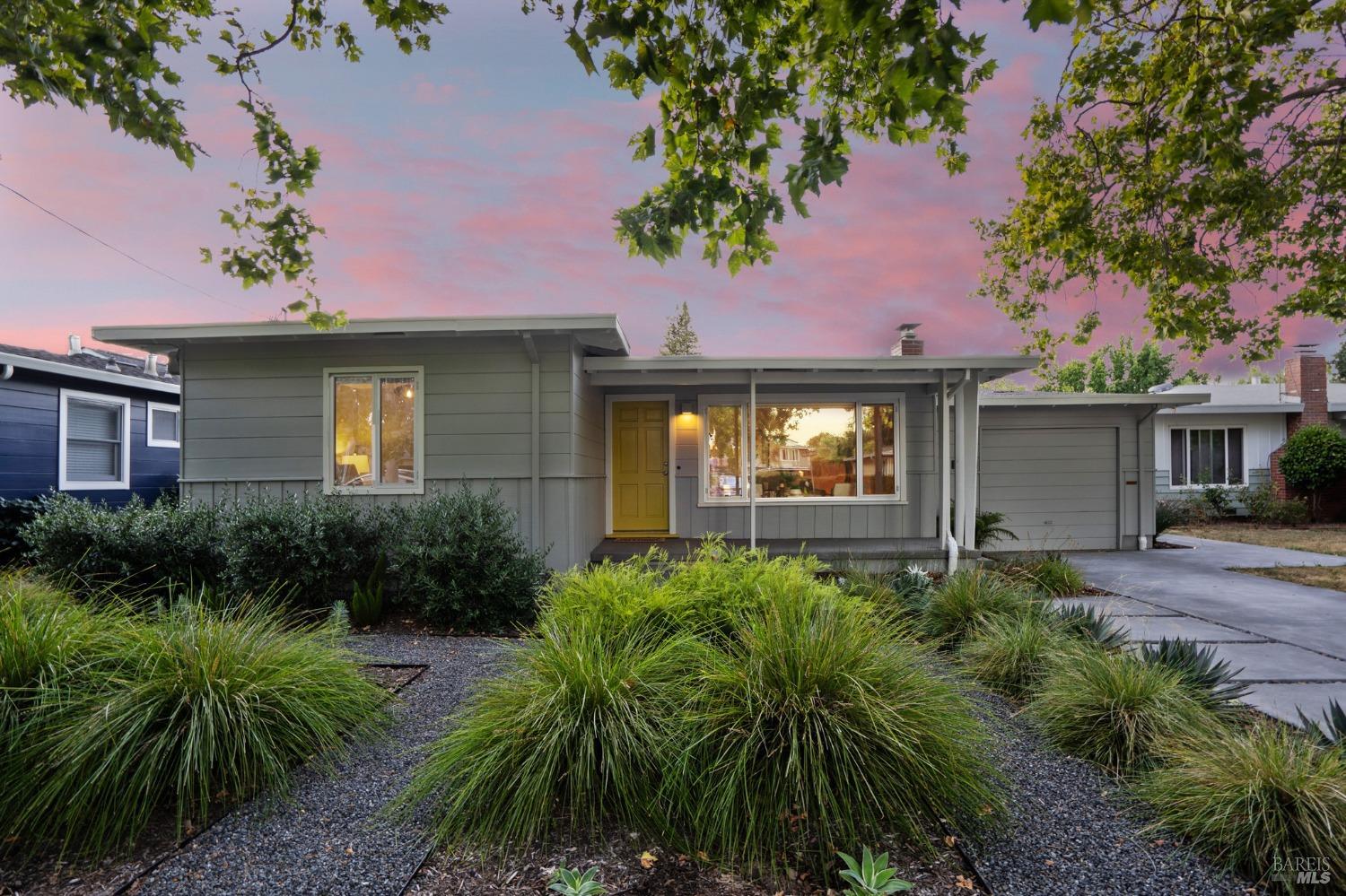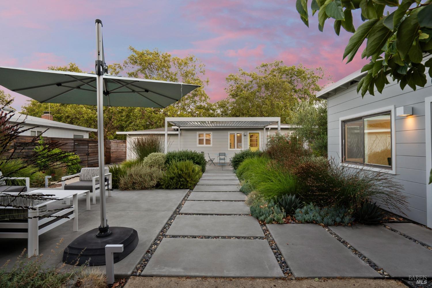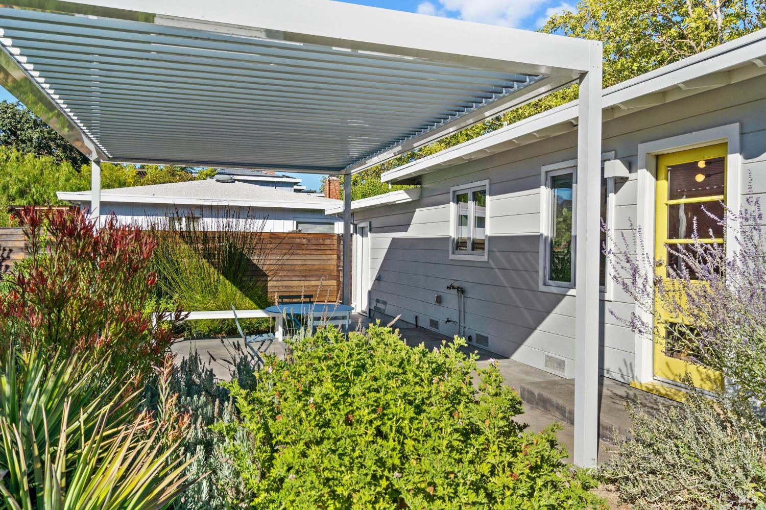 Fall head over heels for this mid-century gem. Nestled on a sprawling, level lot, this home features a true outdoor oasis: a backyard paradise designed for effortless, low-maintenance living and unforgettable entertaining. Extensive covered and open hardscape areas beckon you to savor the meticulously designed outdoor spaces; pergola adjusts for enhanced light control. Professional landscaping transforms the home into a one-of-a-kind retreat, a perfect backdrop for creating lasting memories with guests. Situated on a quiet, serene bend in the road, you'll be greeted by elevated design features including hardwood flooring, a cozy fireplace and updated fixtures and finishes which seamlessly blend with the home's architectural charm and aesthetic appeal. The kitchen features a delightful fusion of vintage accents and modern elements, and includes a stylish Wedgewood stove, Shaker-style cabinetry, subway tile backsplash, and an adjoining dining space filled with cheerful natural light. In addition to the main house, you'll discover a charming accessory dwelling unit, currently configured as a private home office. An attached single-bay garage ensures that parking and storage are never a concern.