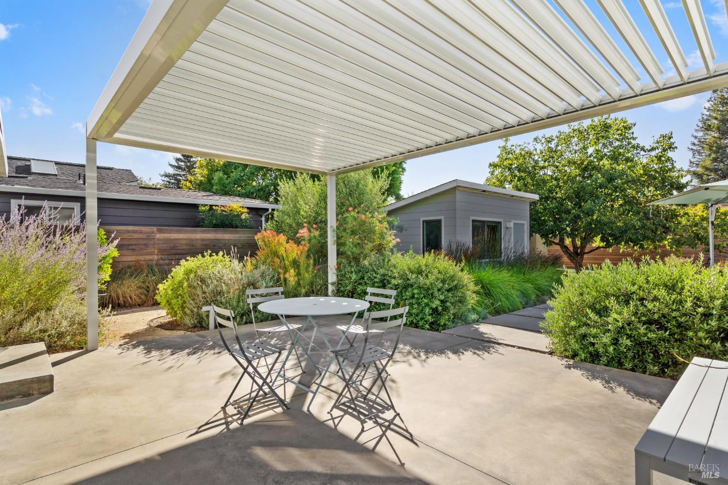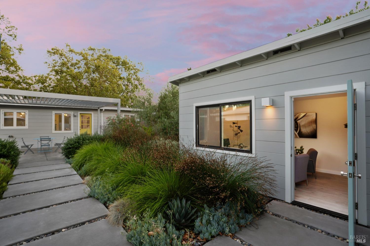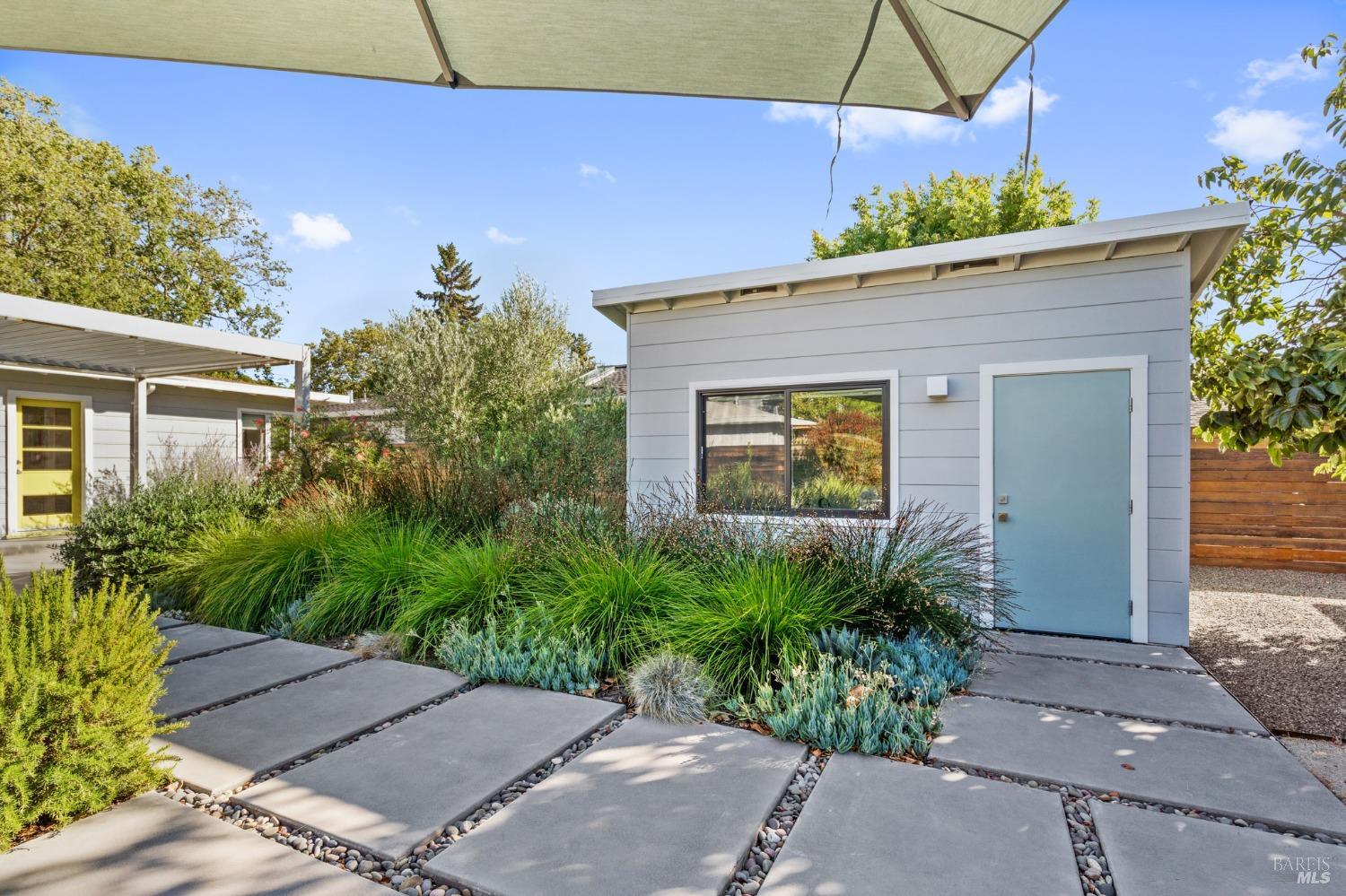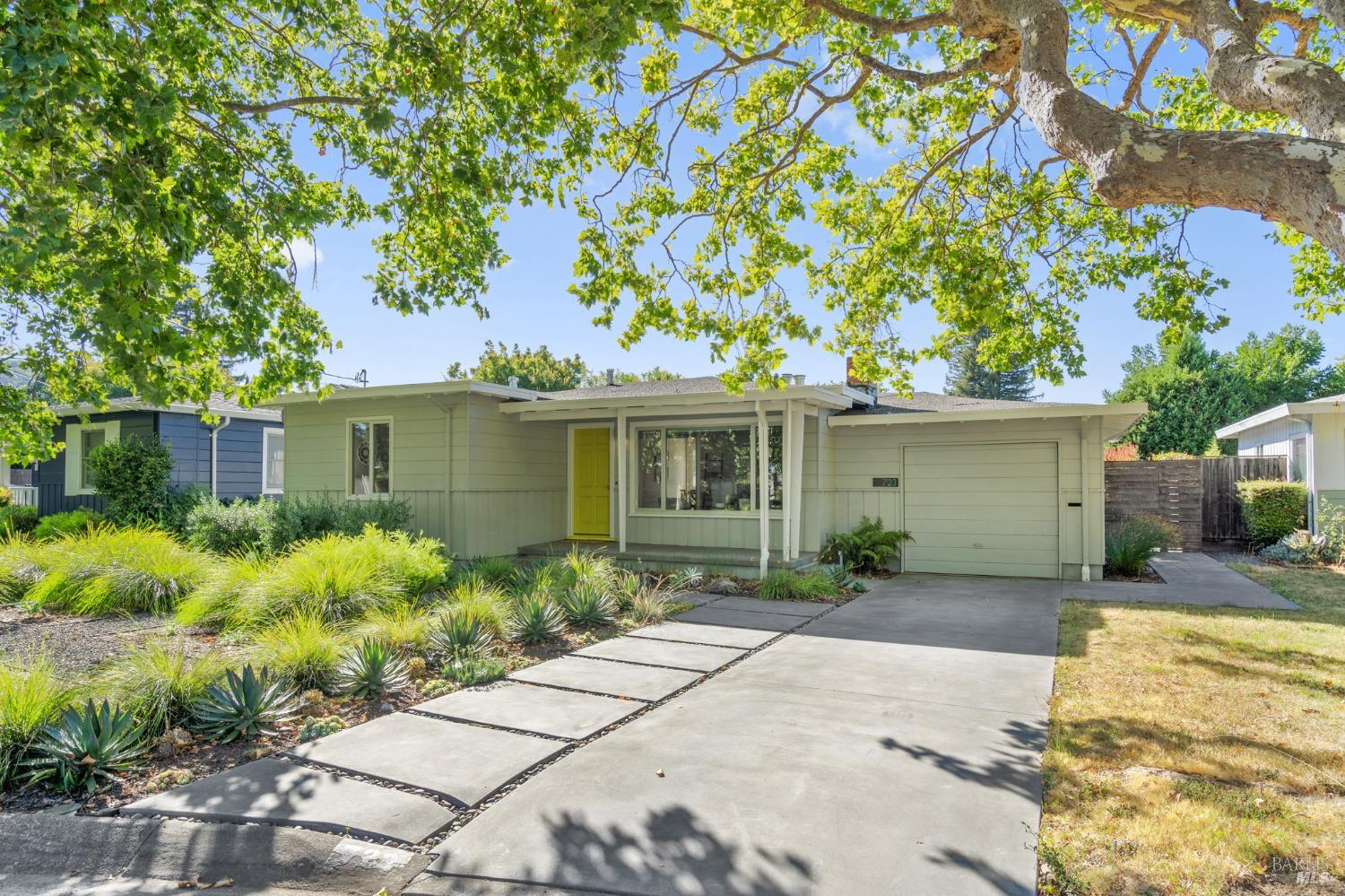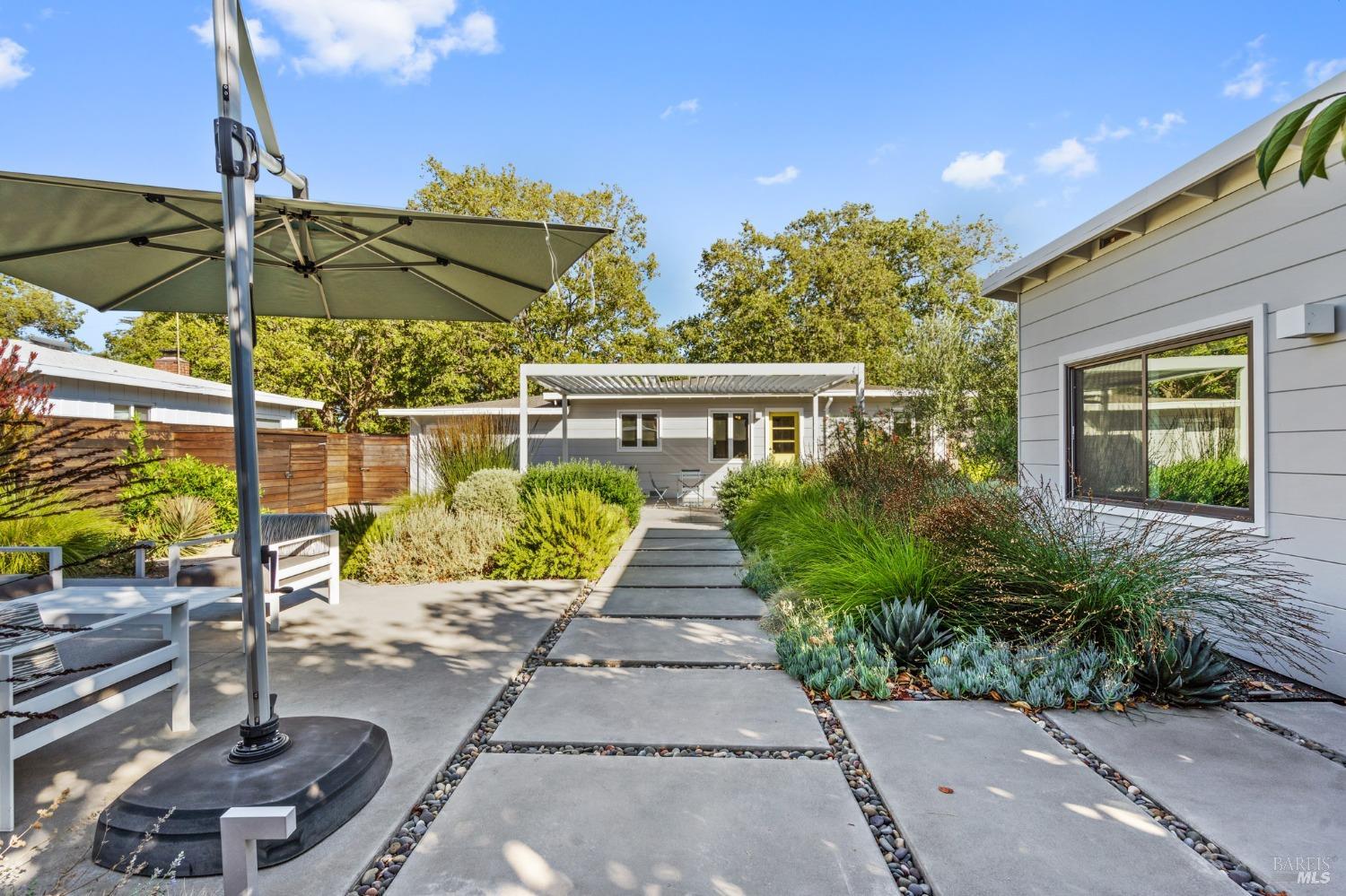 Fall head over heels for this mid-century gem. Nestled on a sprawling, level lot, this home features a true outdoor oasis: a backyard paradise designed for effortless, low-maintenance living and unforgettable entertaining. Extensive covered and open hardscape areas beckon you to savor the meticulously designed outdoor spaces; pergola adjusts for enhanced light control. Professional landscaping transforms the home into a one-of-a-kind retreat, a perfect backdrop for creating lasting memories with guests. Situated on a quiet, serene bend in the road, you'll be greeted by elevated design features including hardwood flooring, a cozy fireplace and updated fixtures and finishes which seamlessly blend with the home's architectural charm and aesthetic appeal. The kitchen features a delightful fusion of vintage accents and modern elements, and includes a stylish Wedgewood stove, Shaker-style cabinetry, subway tile backsplash, and an adjoining dining space filled with cheerful natural light. In addition to the main house, you'll discover a charming accessory dwelling unit, currently configured as a private home office. An attached single-bay garage ensures that parking and storage are never a concern.