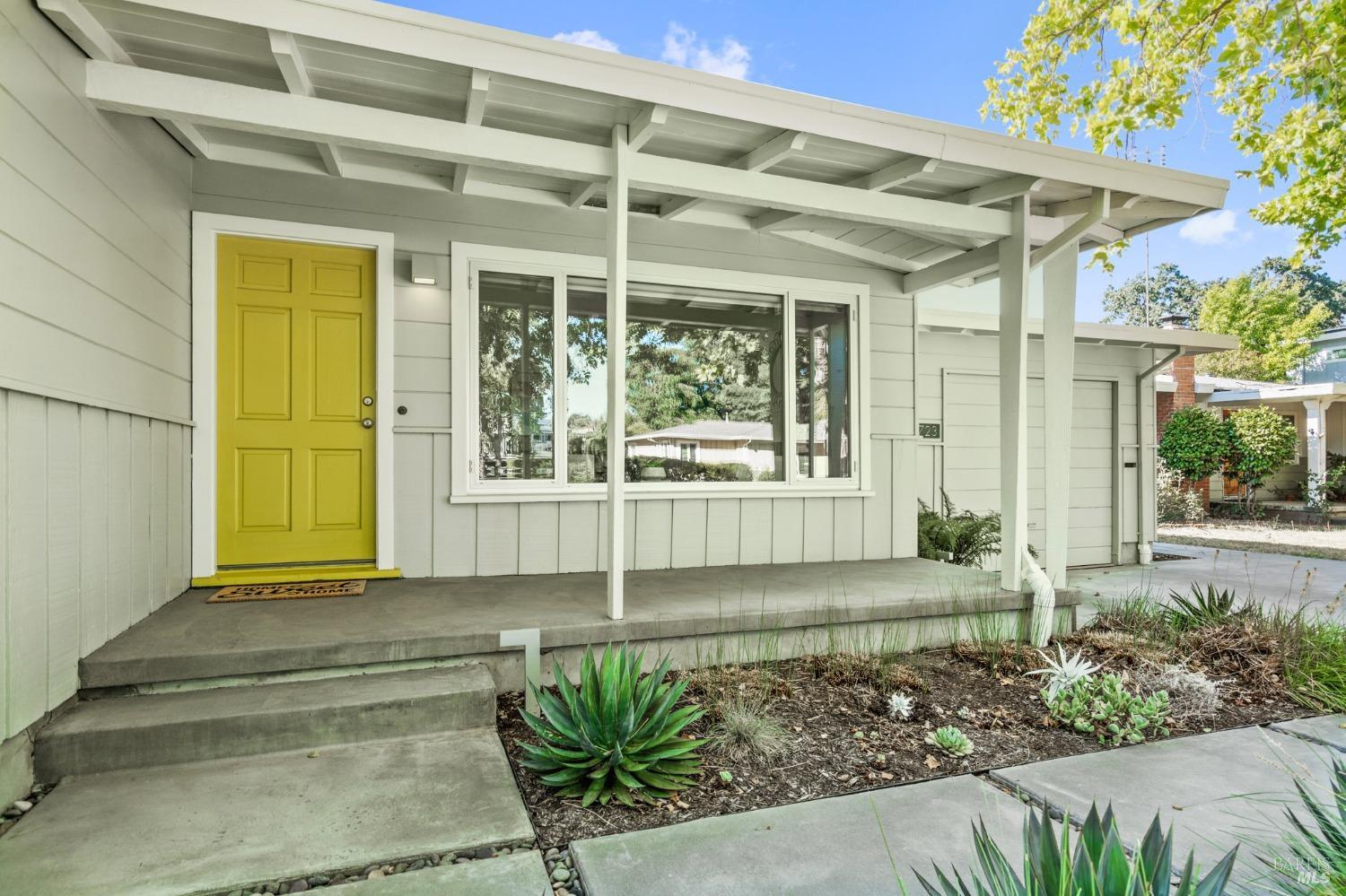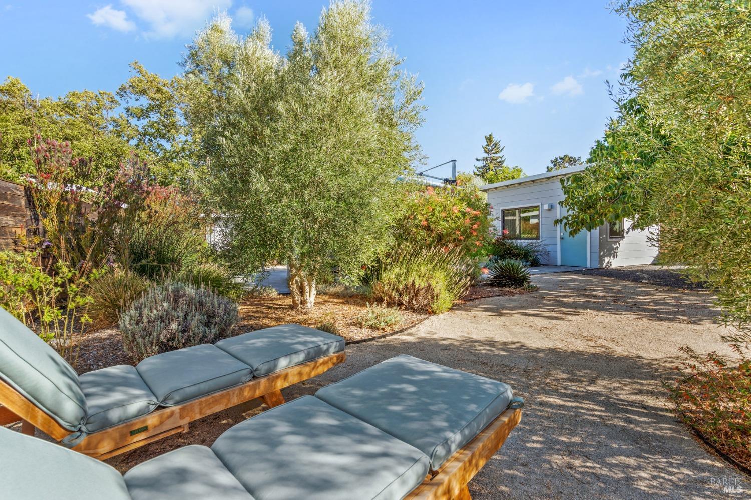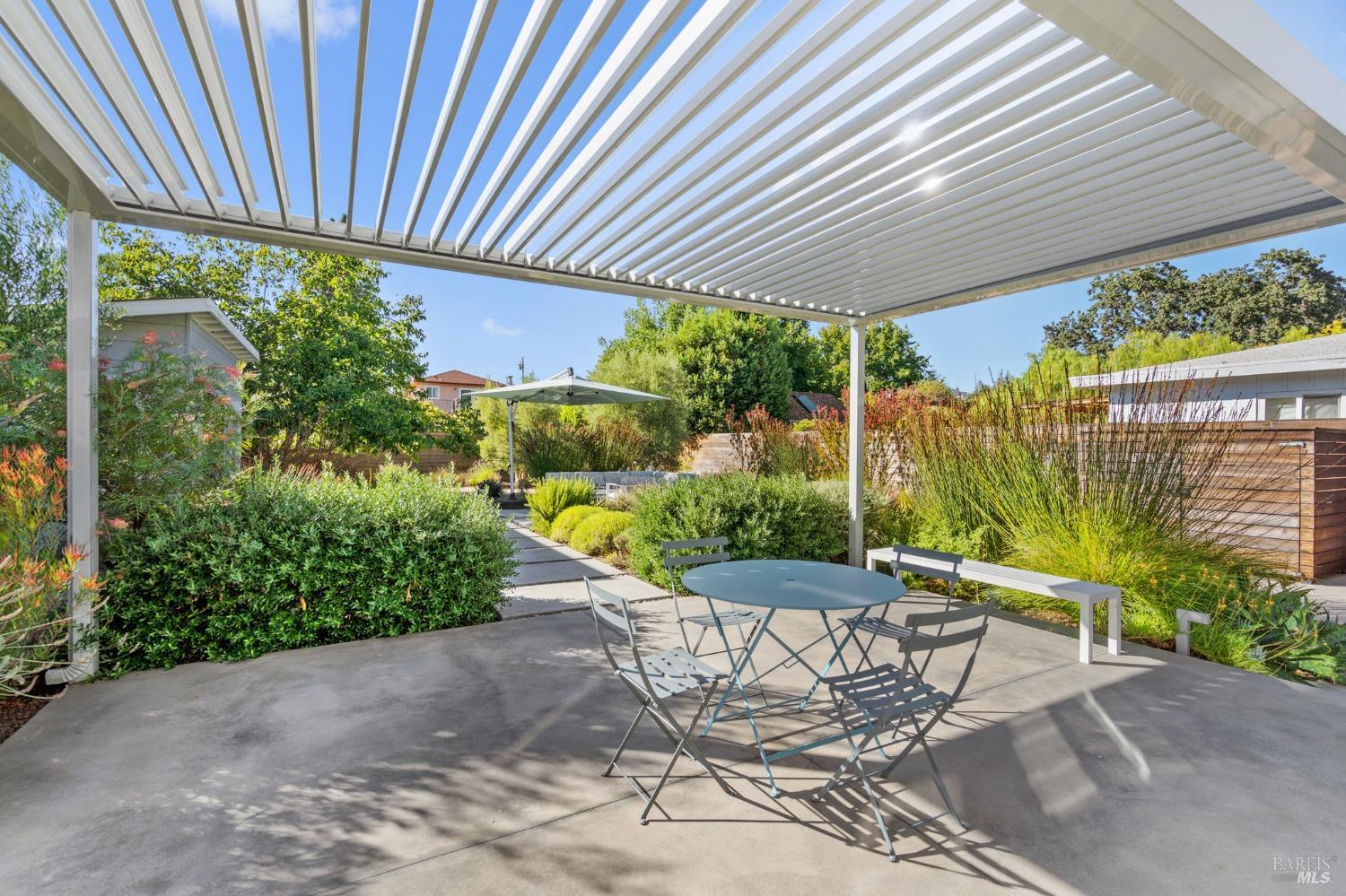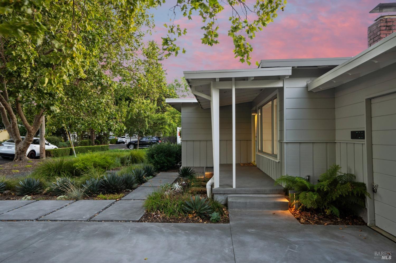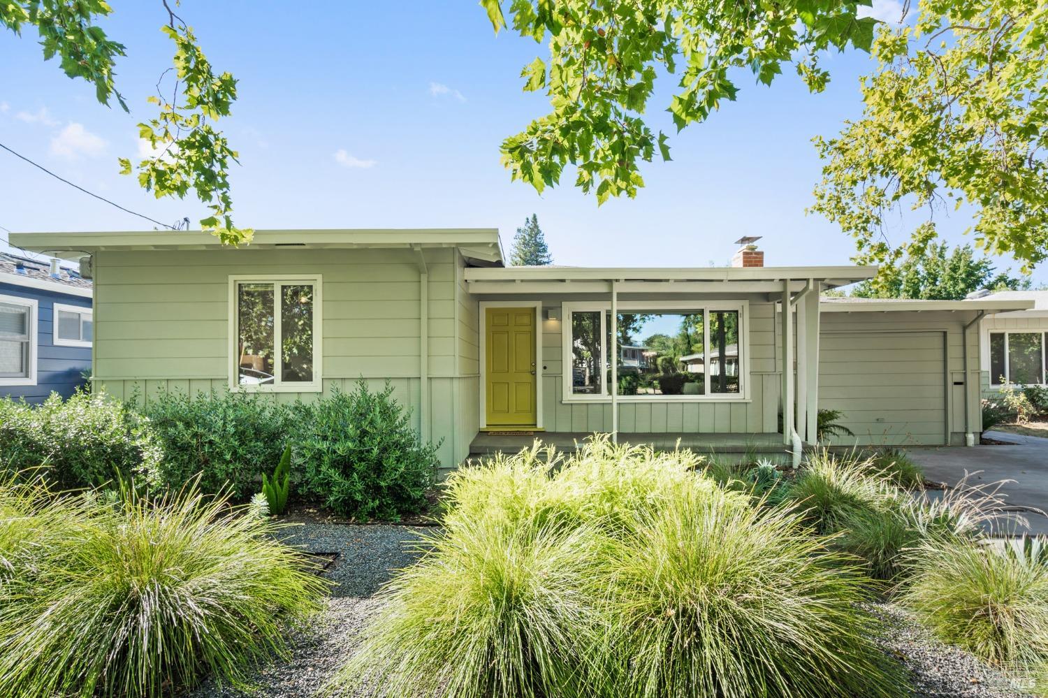 Fall head over heels for this mid-century gem. Nestled on a sprawling, level lot, this home features a true outdoor oasis: a backyard paradise designed for effortless, low-maintenance living and unforgettable entertaining. Extensive covered and open hardscape areas beckon you to savor the meticulously designed outdoor spaces; pergola adjusts for enhanced light control. Professional landscaping transforms the home into a one-of-a-kind retreat, a perfect backdrop for creating lasting memories with guests. Situated on a quiet, serene bend in the road, you'll be greeted by elevated design features including hardwood flooring, a cozy fireplace and updated fixtures and finishes which seamlessly blend with the home's architectural charm and aesthetic appeal. The kitchen features a delightful fusion of vintage accents and modern elements, and includes a stylish Wedgewood stove, Shaker-style cabinetry, subway tile backsplash, and an adjoining dining space filled with cheerful natural light. In addition to the main house, you'll discover a charming accessory dwelling unit, currently configured as a private home office. An attached single-bay garage ensures that parking and storage are never a concern.