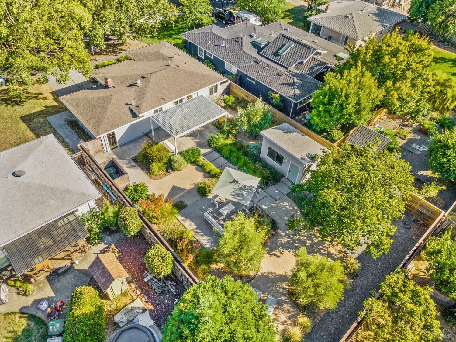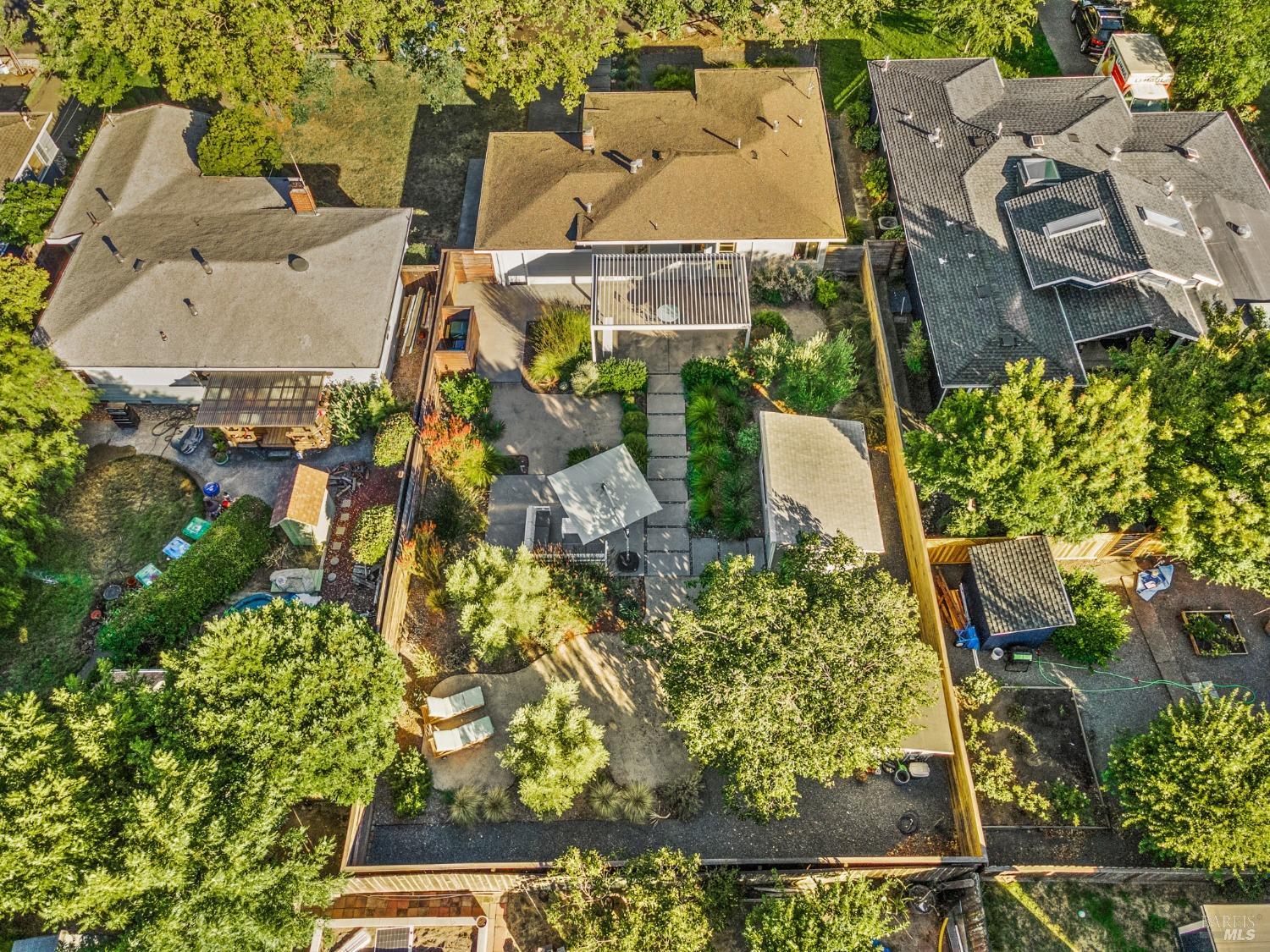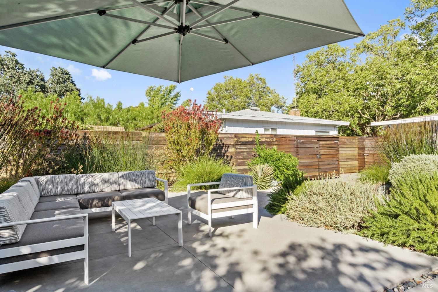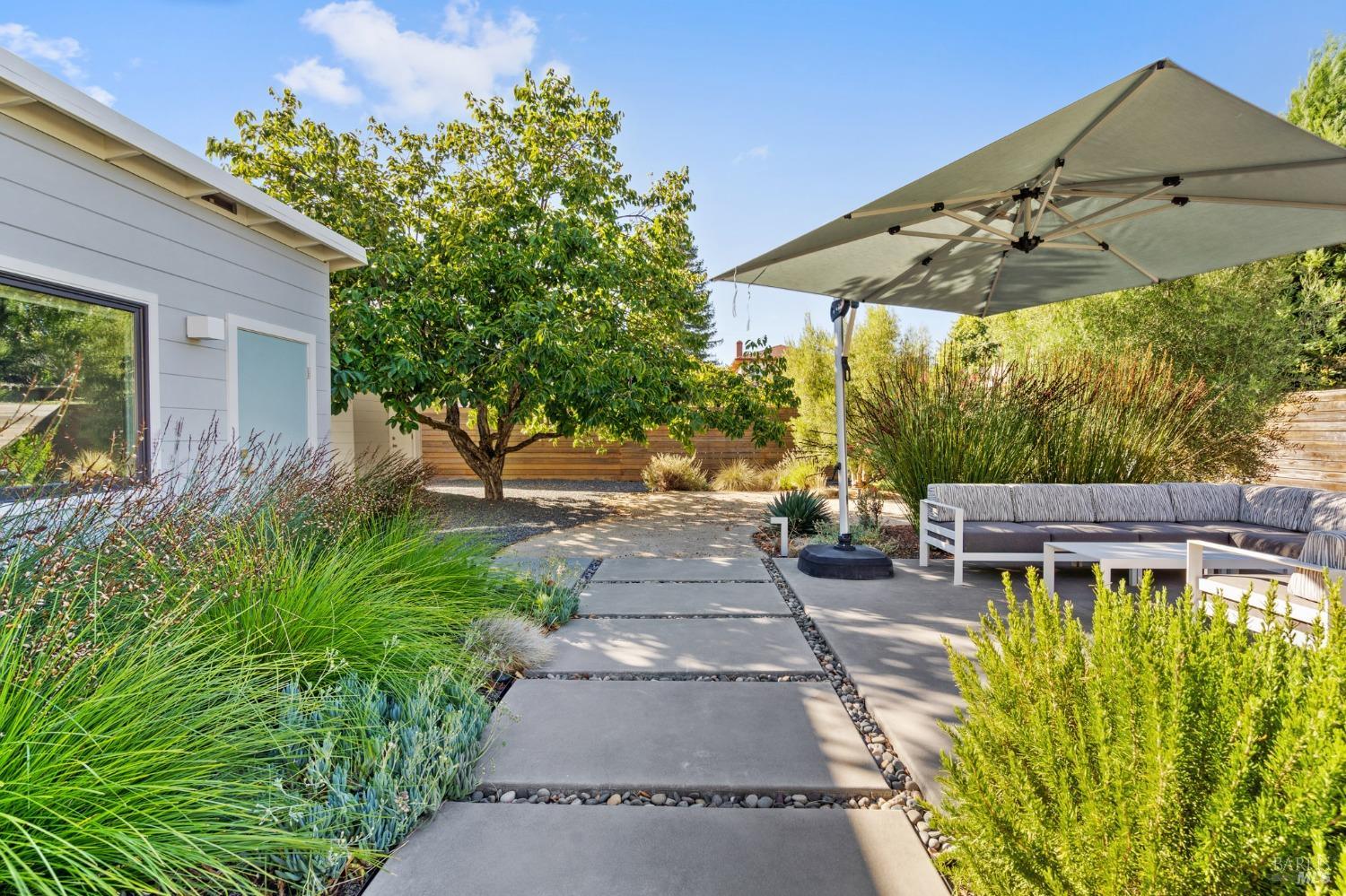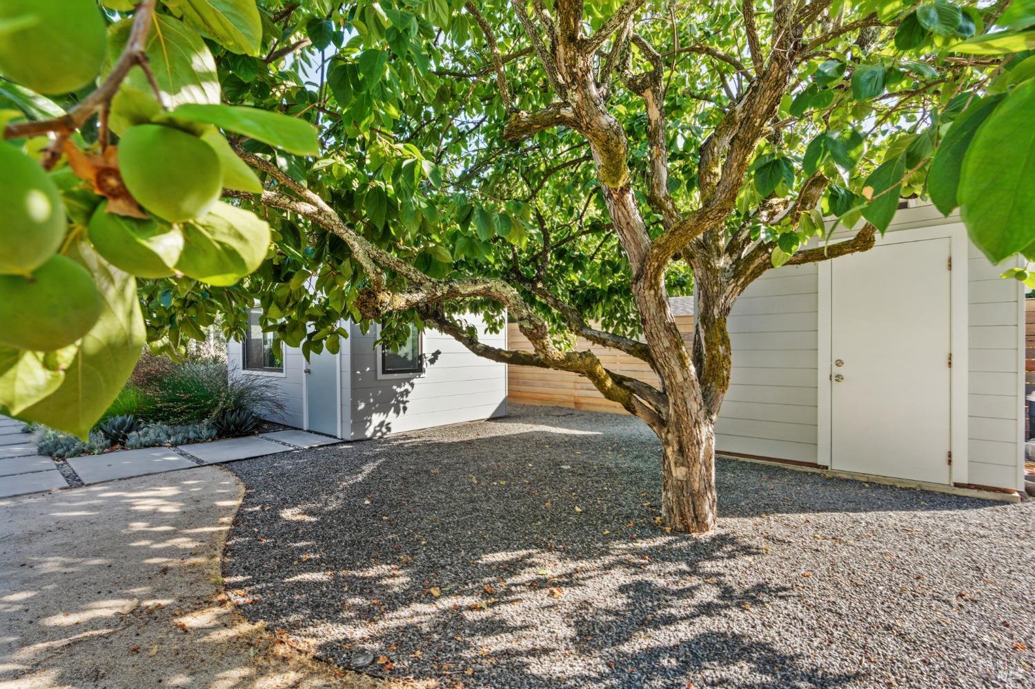 Fall head over heels for this mid-century gem. Nestled on a sprawling, level lot, this home features a true outdoor oasis: a backyard paradise designed for effortless, low-maintenance living and unforgettable entertaining. Extensive covered and open hardscape areas beckon you to savor the meticulously designed outdoor spaces; pergola adjusts for enhanced light control. Professional landscaping transforms the home into a one-of-a-kind retreat, a perfect backdrop for creating lasting memories with guests. Situated on a quiet, serene bend in the road, you'll be greeted by elevated design features including hardwood flooring, a cozy fireplace and updated fixtures and finishes which seamlessly blend with the home's architectural charm and aesthetic appeal. The kitchen features a delightful fusion of vintage accents and modern elements, and includes a stylish Wedgewood stove, Shaker-style cabinetry, subway tile backsplash, and an adjoining dining space filled with cheerful natural light. In addition to the main house, you'll discover a charming accessory dwelling unit, currently configured as a private home office. An attached single-bay garage ensures that parking and storage are never a concern.