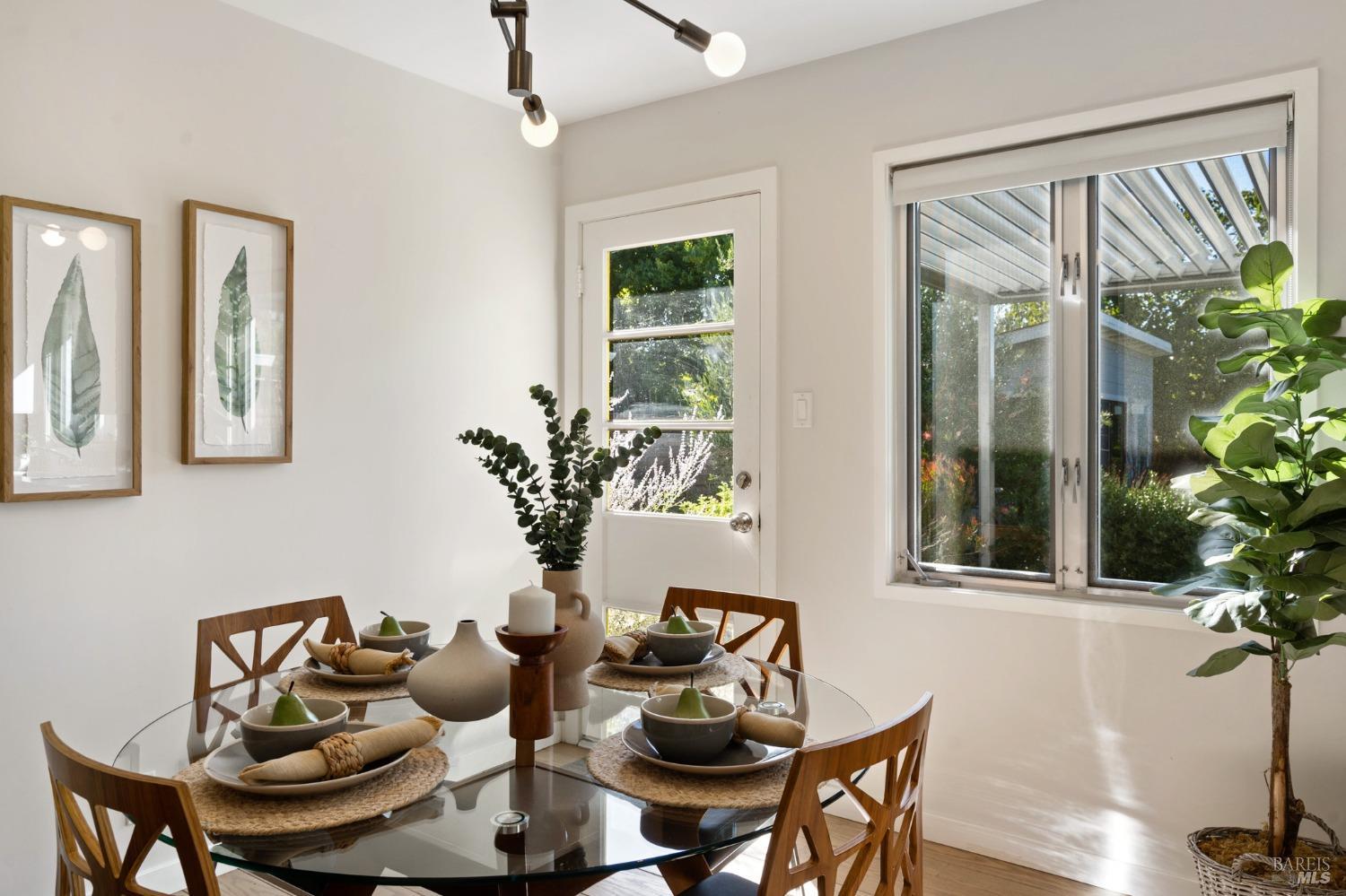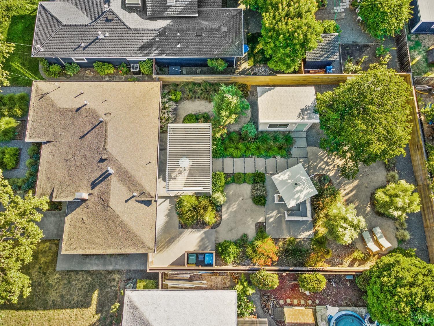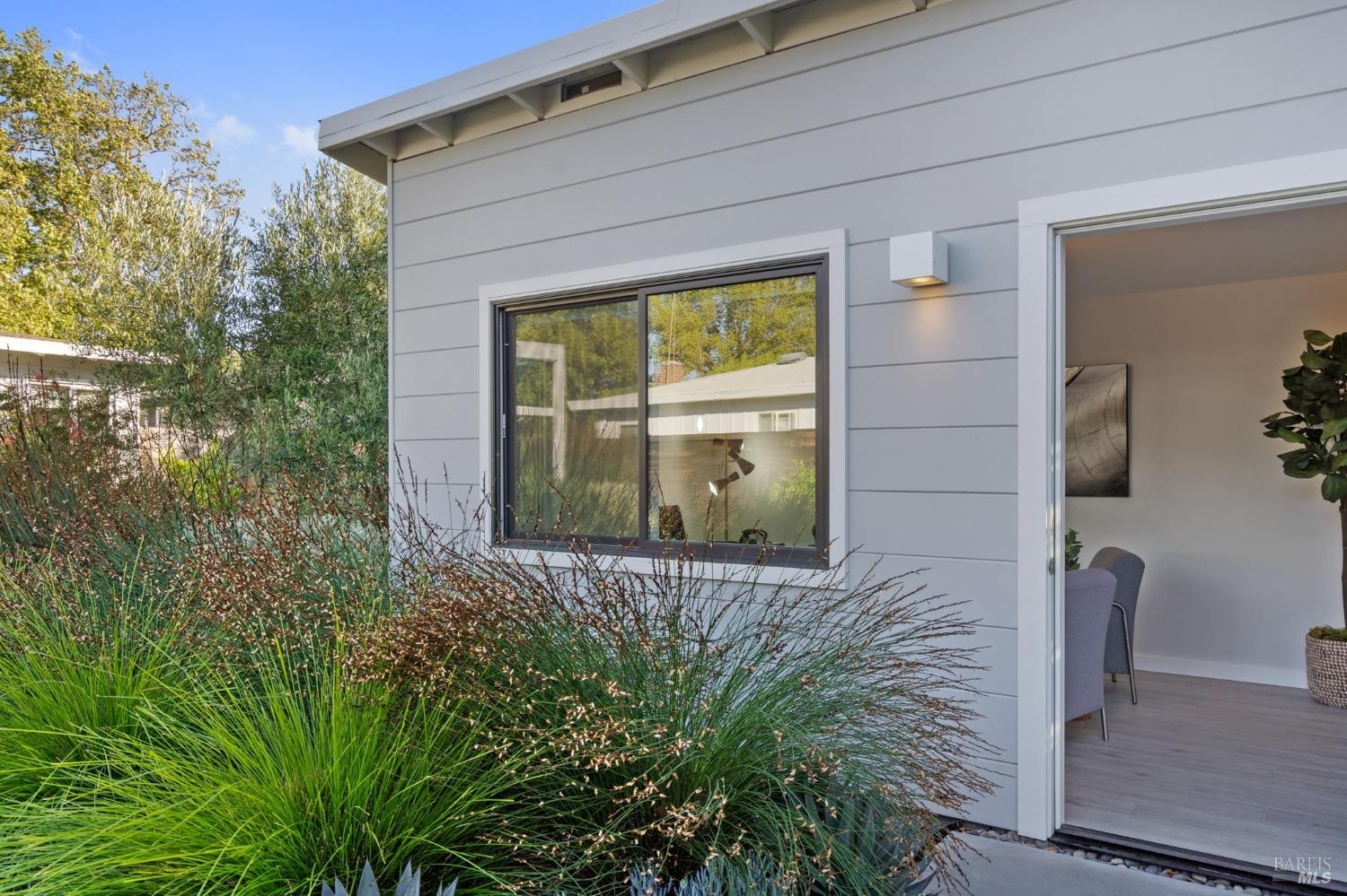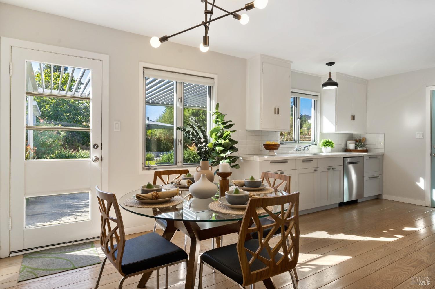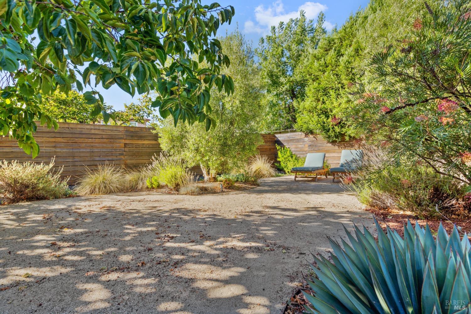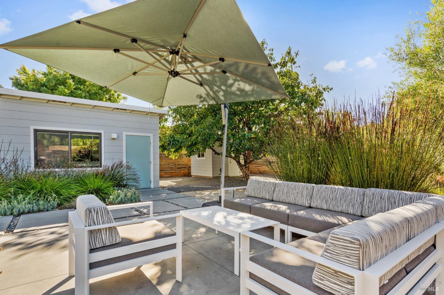Fall head over heels for this mid-century gem. Nestled on a sprawling, level lot, this home features a true outdoor oasis: a backyard paradise designed for effortless, low-maintenance living and unforgettable entertaining. Extensive covered and open hardscape areas beckon you to savor the meticulously designed outdoor spaces; pergola adjusts for enhanced light control. Professional landscaping transforms the home into a one-of-a-kind retreat, a perfect backdrop for creating lasting memories with guests. Situated on a quiet, serene bend in the road, you'll be greeted by elevated design features including hardwood flooring, a cozy fireplace and updated fixtures and finishes which seamlessly blend with the home's architectural charm and aesthetic appeal. The kitchen features a delightful fusion of vintage accents and modern elements, and includes a stylish Wedgewood stove, Shaker-style cabinetry, subway tile backsplash, and an adjoining dining space filled with cheerful natural light. In addition to the main house, you'll discover a charming accessory dwelling unit, currently configured as a private home office. An attached single-bay garage ensures that parking and storage are never a concern.
