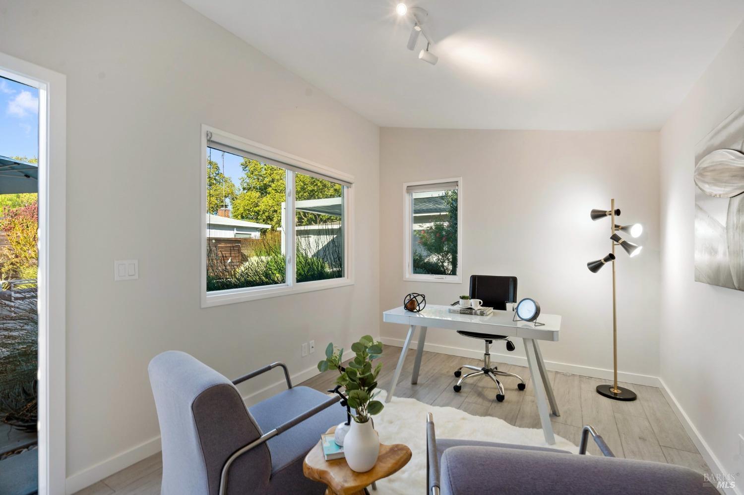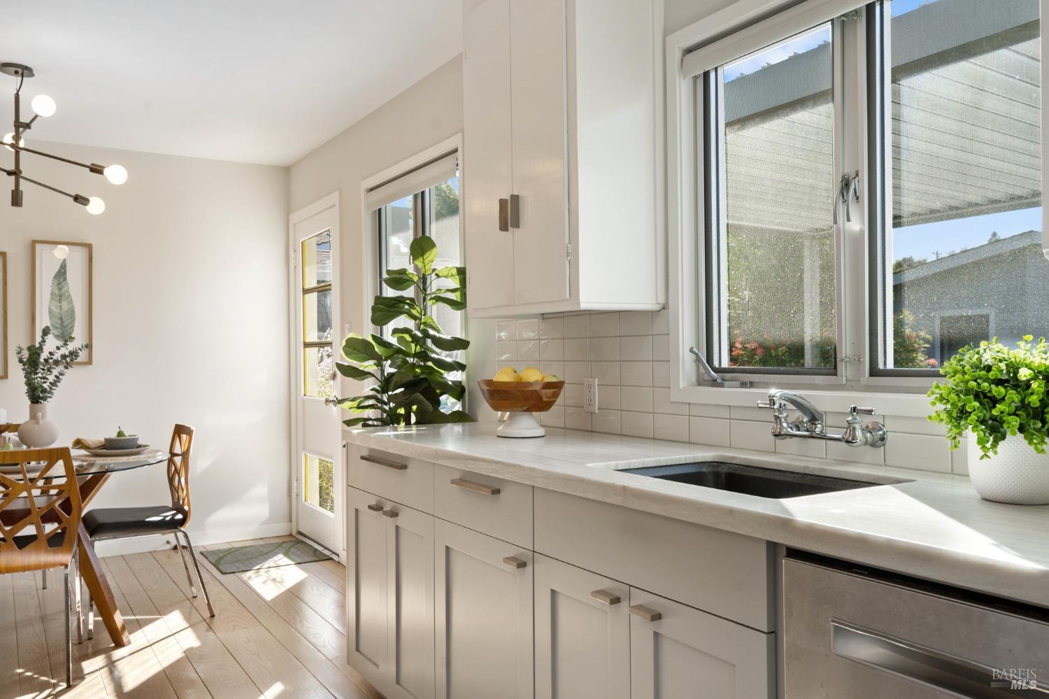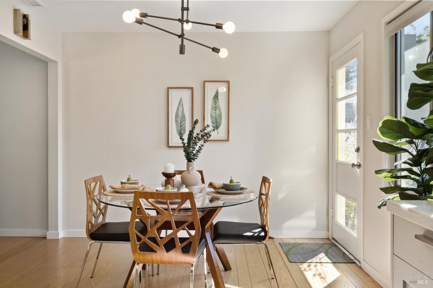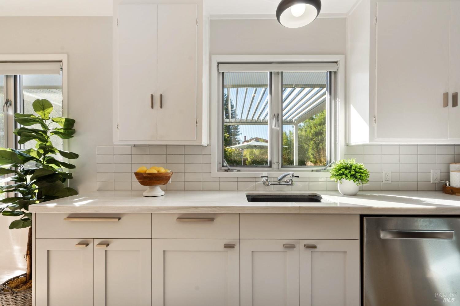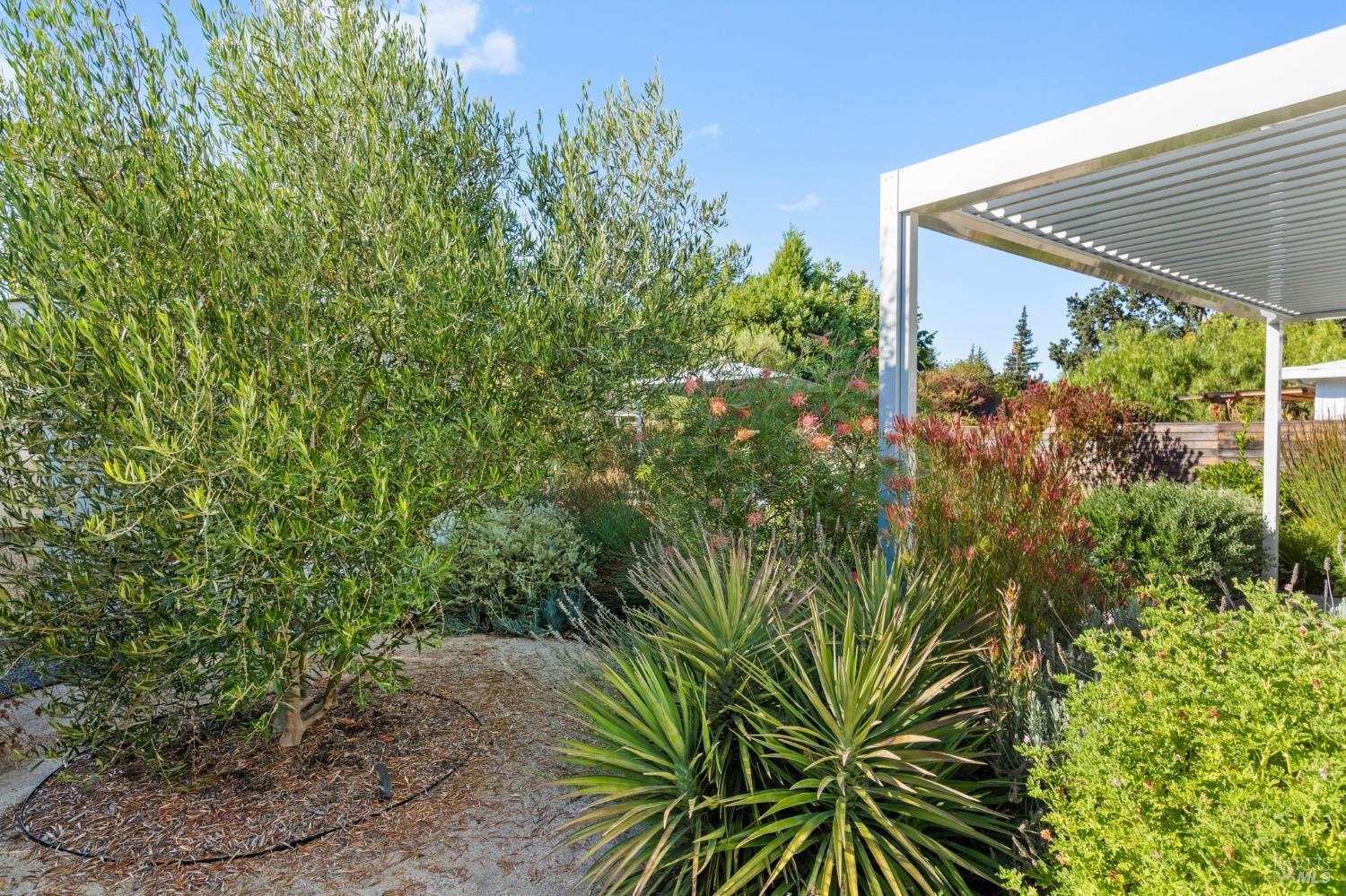 Fall head over heels for this mid-century gem. Nestled on a sprawling, level lot, this home features a true outdoor oasis: a backyard paradise designed for effortless, low-maintenance living and unforgettable entertaining. Extensive covered and open hardscape areas beckon you to savor the meticulously designed outdoor spaces; pergola adjusts for enhanced light control. Professional landscaping transforms the home into a one-of-a-kind retreat, a perfect backdrop for creating lasting memories with guests. Situated on a quiet, serene bend in the road, you'll be greeted by elevated design features including hardwood flooring, a cozy fireplace and updated fixtures and finishes which seamlessly blend with the home's architectural charm and aesthetic appeal. The kitchen features a delightful fusion of vintage accents and modern elements, and includes a stylish Wedgewood stove, Shaker-style cabinetry, subway tile backsplash, and an adjoining dining space filled with cheerful natural light. In addition to the main house, you'll discover a charming accessory dwelling unit, currently configured as a private home office. An attached single-bay garage ensures that parking and storage are never a concern.