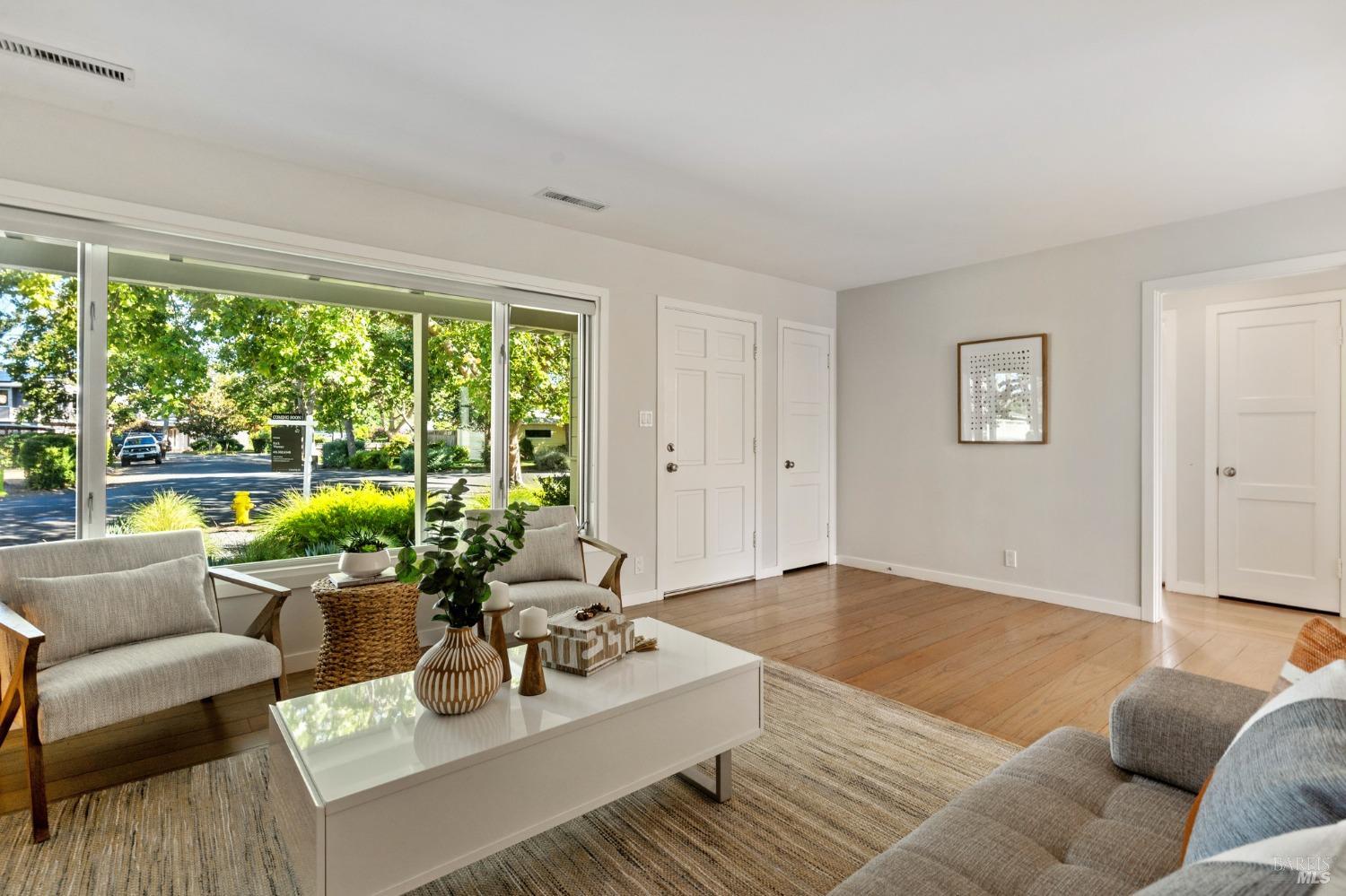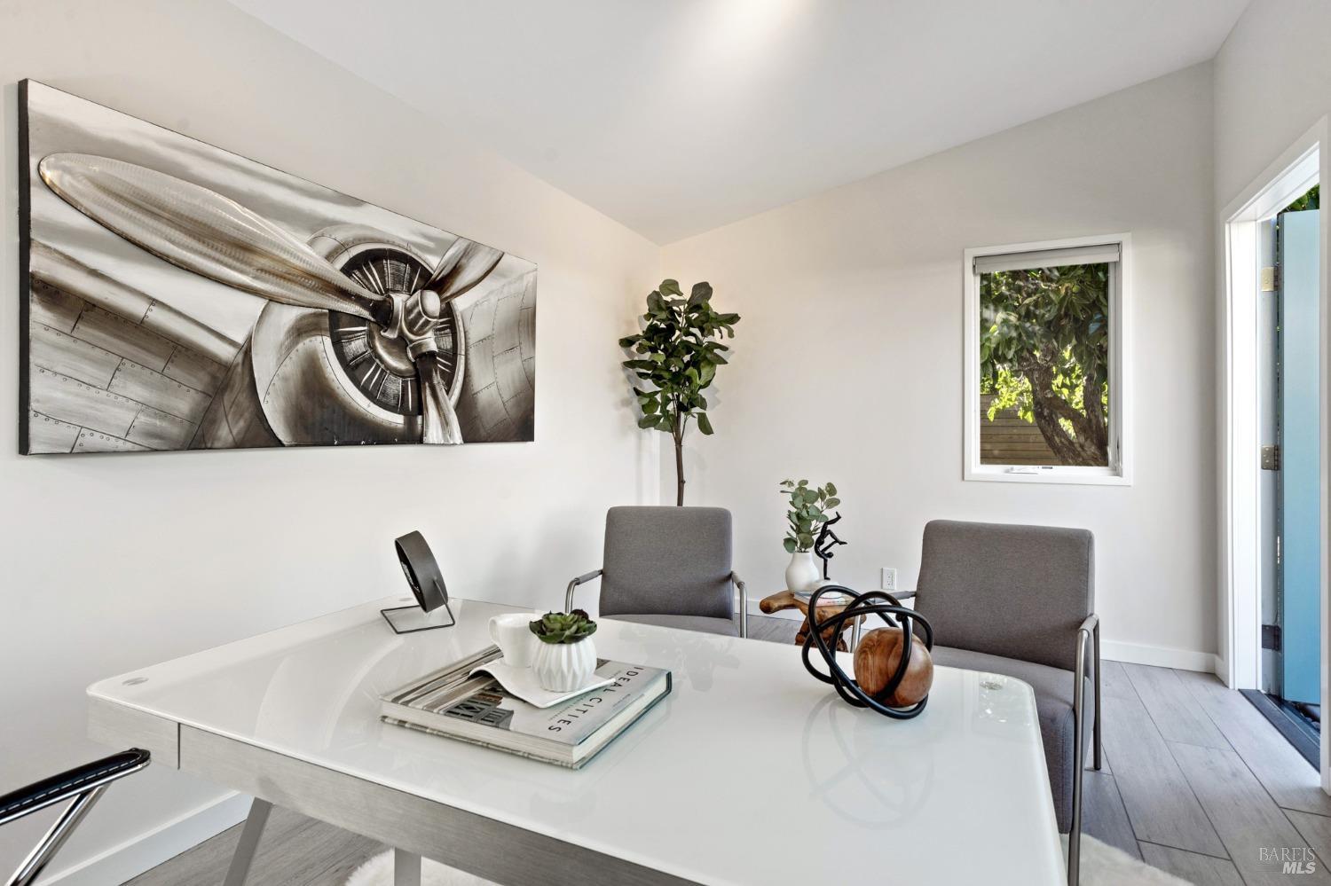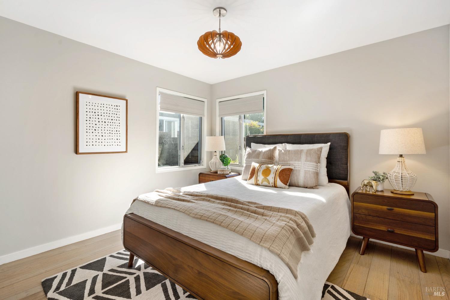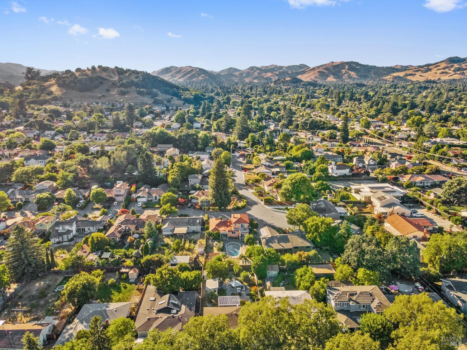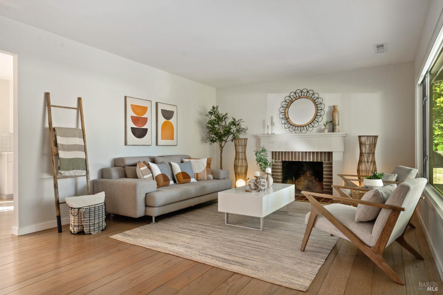 Fall head over heels for this mid-century gem. Nestled on a sprawling, level lot, this home features a true outdoor oasis: a backyard paradise designed for effortless, low-maintenance living and unforgettable entertaining. Extensive covered and open hardscape areas beckon you to savor the meticulously designed outdoor spaces; pergola adjusts for enhanced light control. Professional landscaping transforms the home into a one-of-a-kind retreat, a perfect backdrop for creating lasting memories with guests. Situated on a quiet, serene bend in the road, you'll be greeted by elevated design features including hardwood flooring, a cozy fireplace and updated fixtures and finishes which seamlessly blend with the home's architectural charm and aesthetic appeal. The kitchen features a delightful fusion of vintage accents and modern elements, and includes a stylish Wedgewood stove, Shaker-style cabinetry, subway tile backsplash, and an adjoining dining space filled with cheerful natural light. In addition to the main house, you'll discover a charming accessory dwelling unit, currently configured as a private home office. An attached single-bay garage ensures that parking and storage are never a concern.