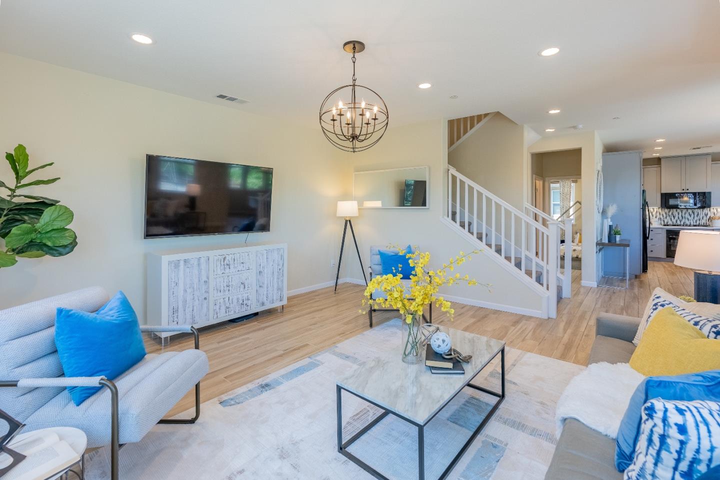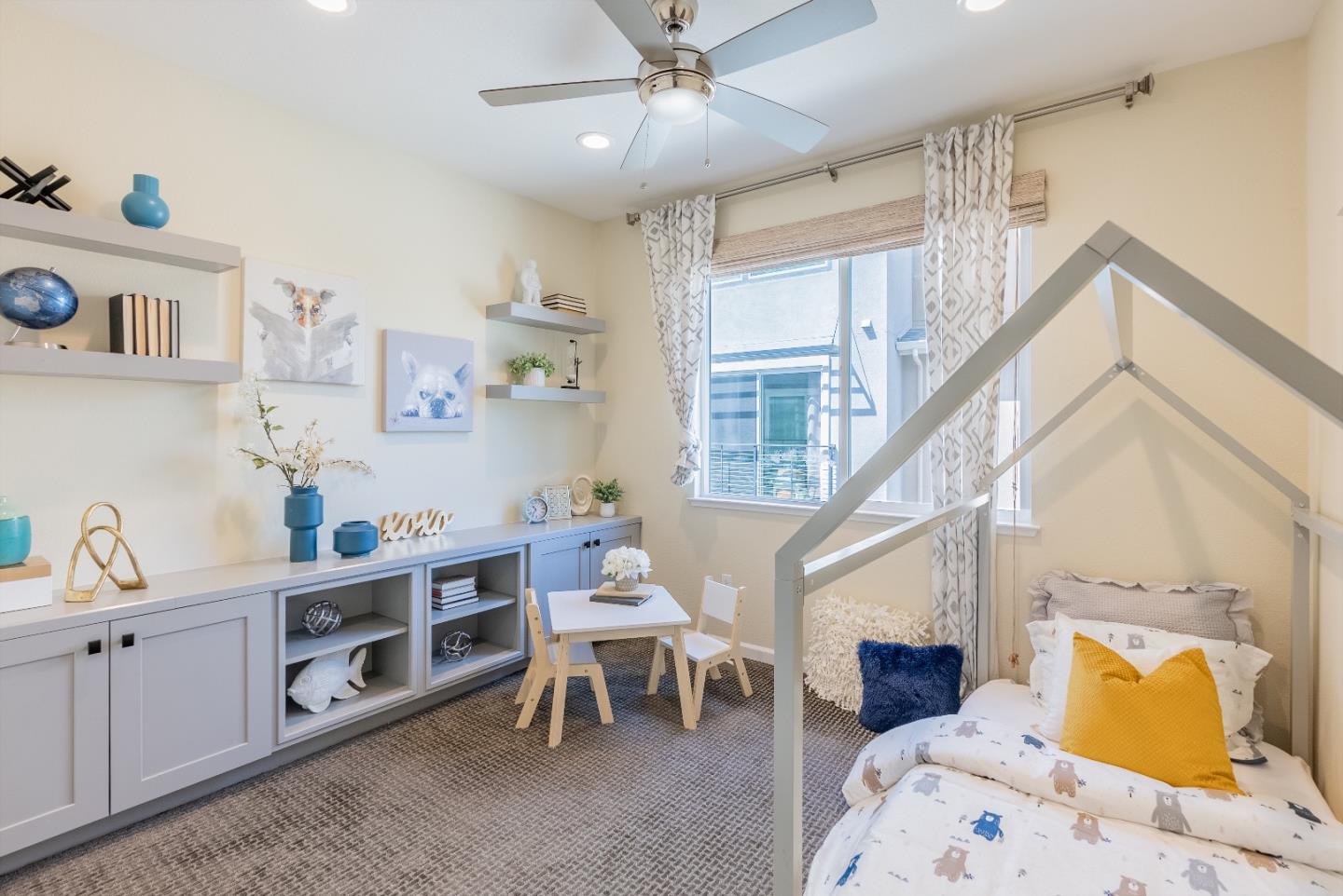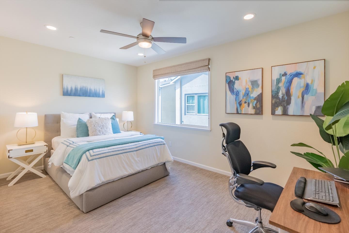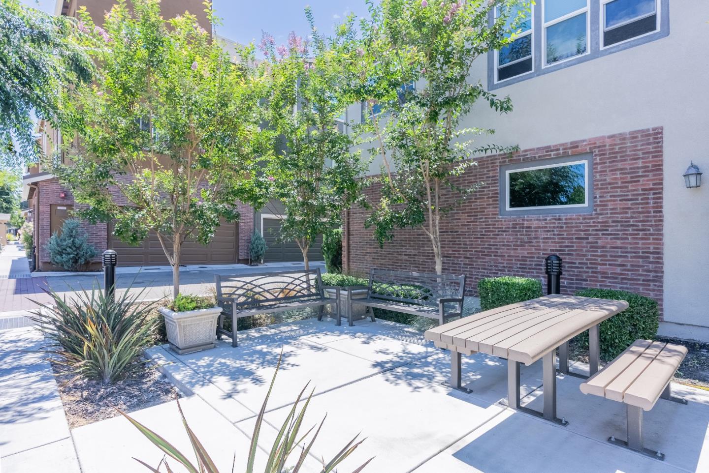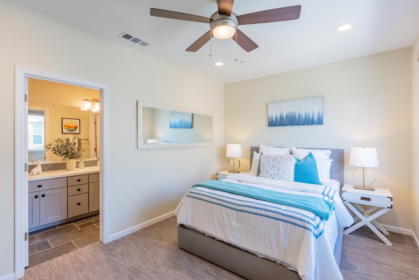 Model tri-level end unit, built in 2017, offers an abundance of natural light and an open floor plan. Main floor bedroom with en suite bath, walk in closet and personal air conditioning is the perfect retreat for extended family or an office. The chef's kitchen with quartz countertops, upgraded appliances and designer cabinets includes an eat in dining area open to an oversized living room with ceramic tile floors with a hardwood look and feel plus private outdoor patio on the main floor. A spacious bedroom with built-in cabinetry and hall bath complete this level. On the third floor are two more bedrooms each with en suite bathroom one with dual sink vanity and two walk in closets, built in hall cabinetry and laundry room. Deluxe drapery and recessed lighting throughout. Air condition and two car attached garage. This home is situated with easy access to light rail, Caltrain, major freeways, just minutes to downtown Sunnyvale. Walking distance to Apple Campus.