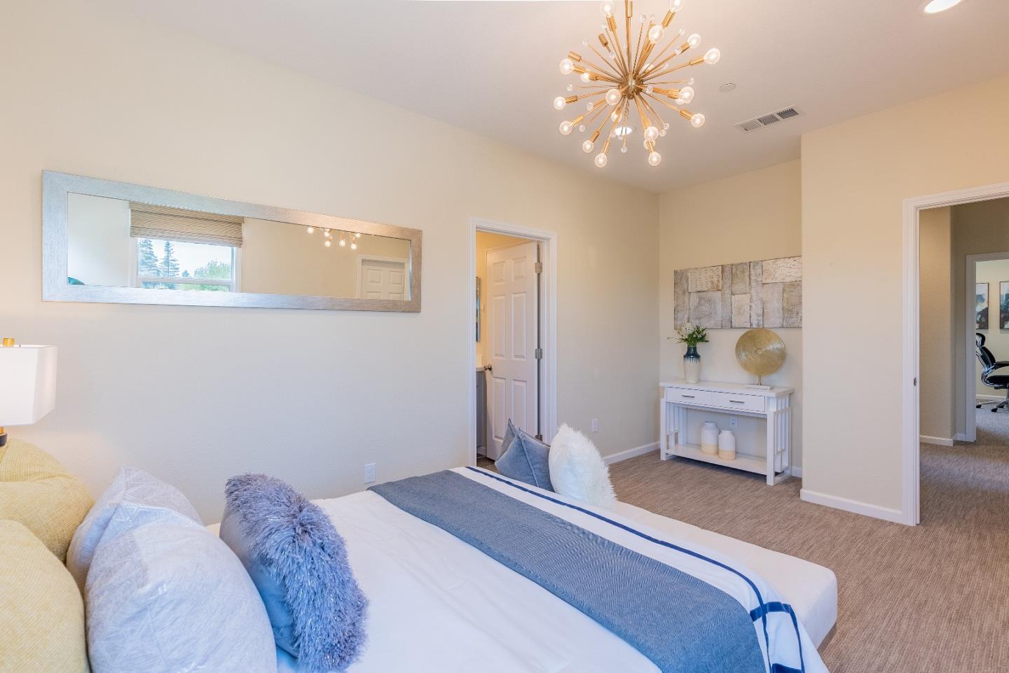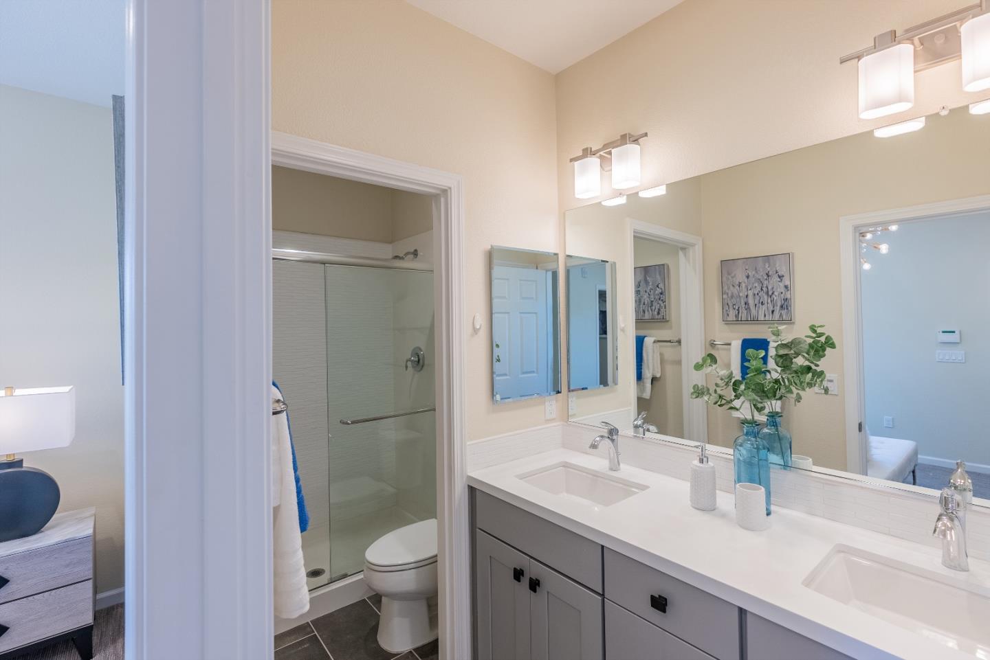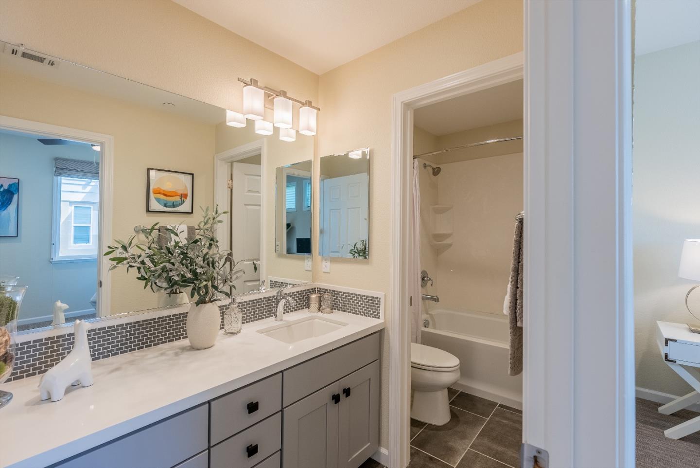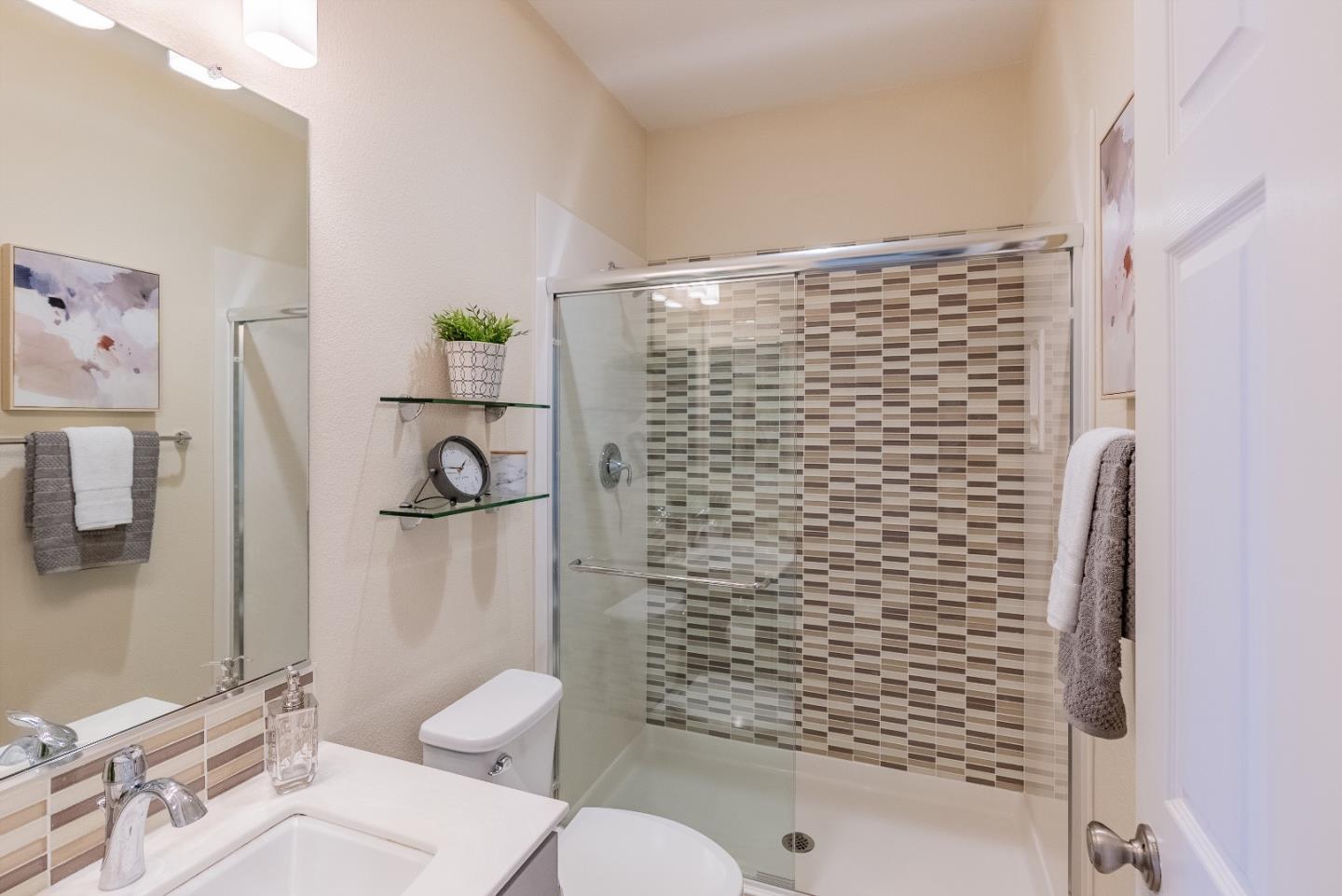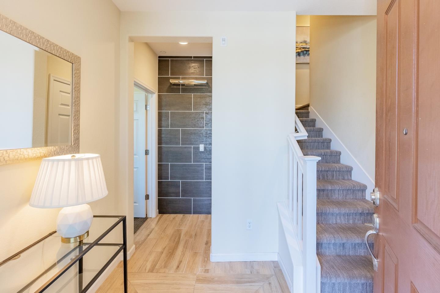 Model tri-level end unit, built in 2017, offers an abundance of natural light and an open floor plan. Main floor bedroom with en suite bath, walk in closet and personal air conditioning is the perfect retreat for extended family or an office. The chef's kitchen with quartz countertops, upgraded appliances and designer cabinets includes an eat in dining area open to an oversized living room with ceramic tile floors with a hardwood look and feel plus private outdoor patio on the main floor. A spacious bedroom with built-in cabinetry and hall bath complete this level. On the third floor are two more bedrooms each with en suite bathroom one with dual sink vanity and two walk in closets, built in hall cabinetry and laundry room. Deluxe drapery and recessed lighting throughout. Air condition and two car attached garage. This home is situated with easy access to light rail, Caltrain, major freeways, just minutes to downtown Sunnyvale. Walking distance to Apple Campus.