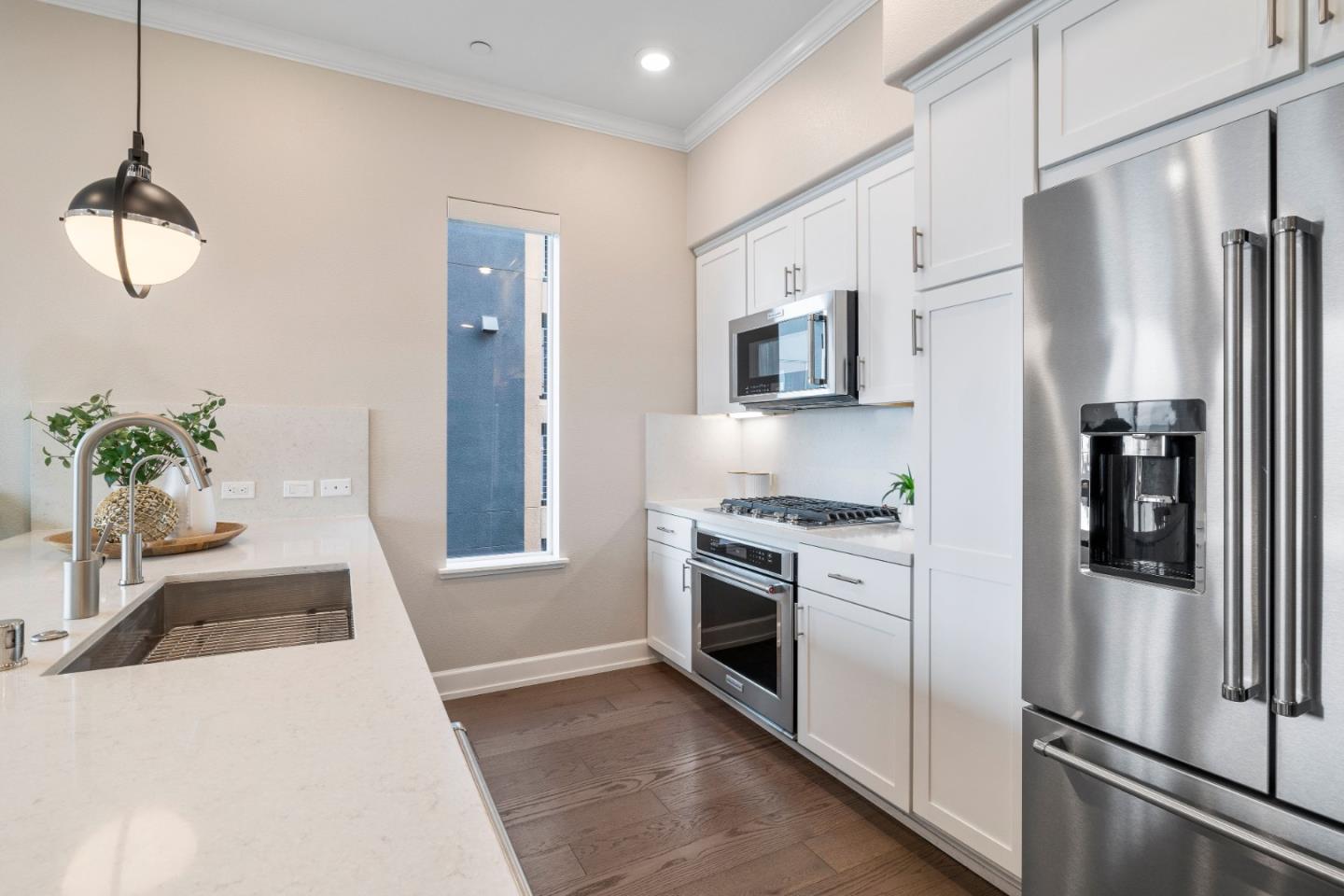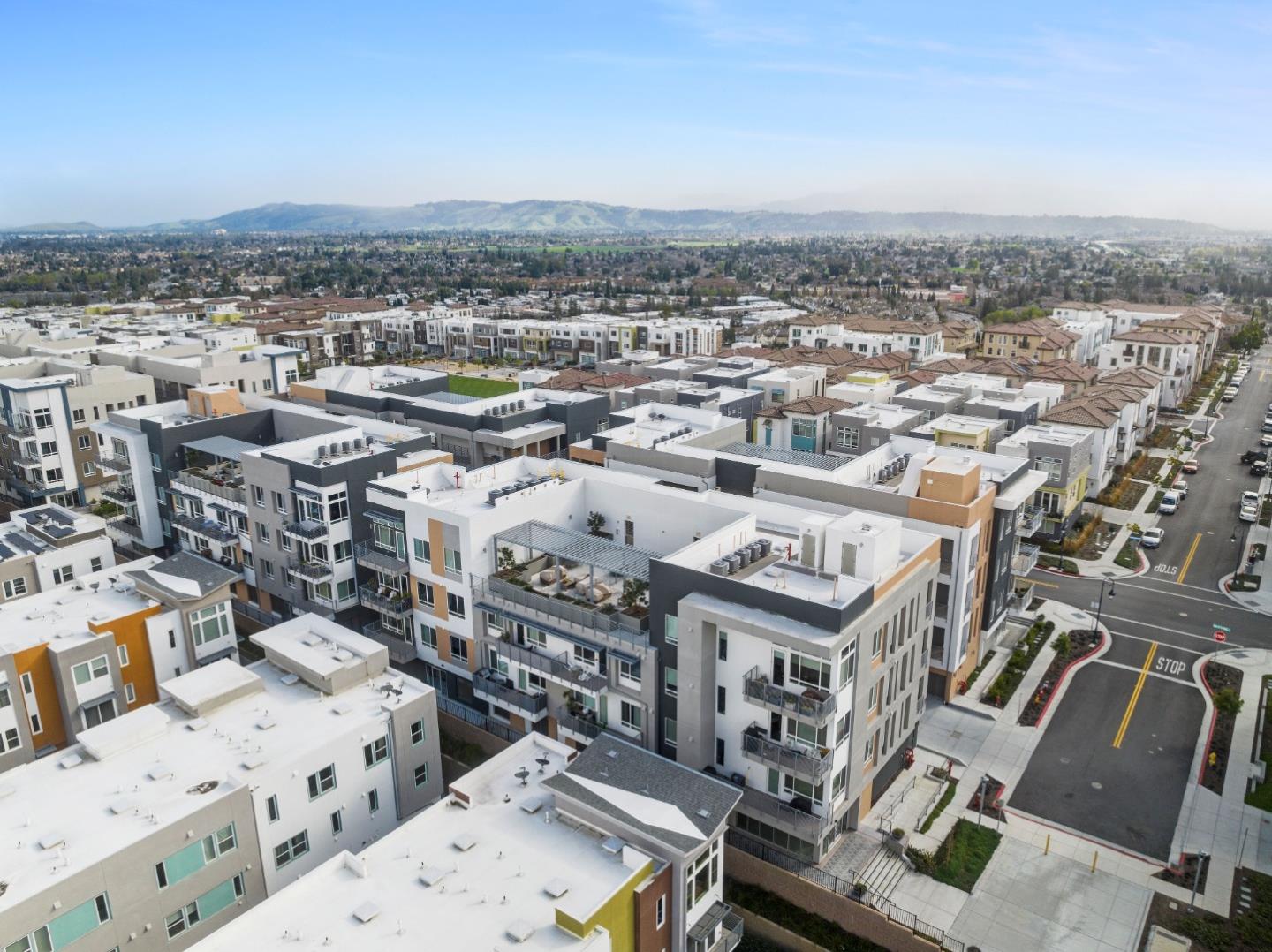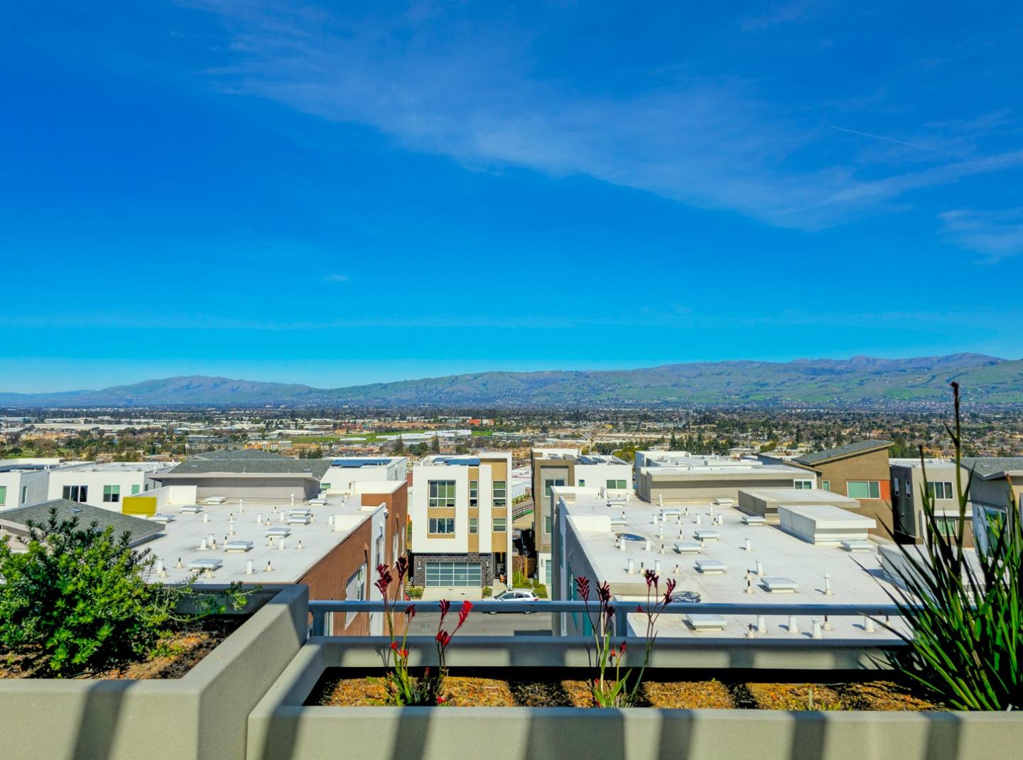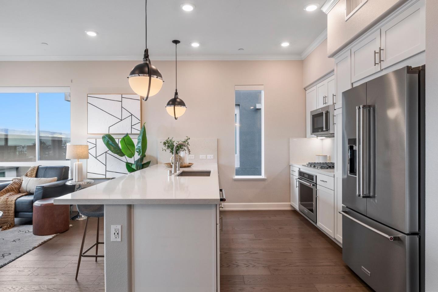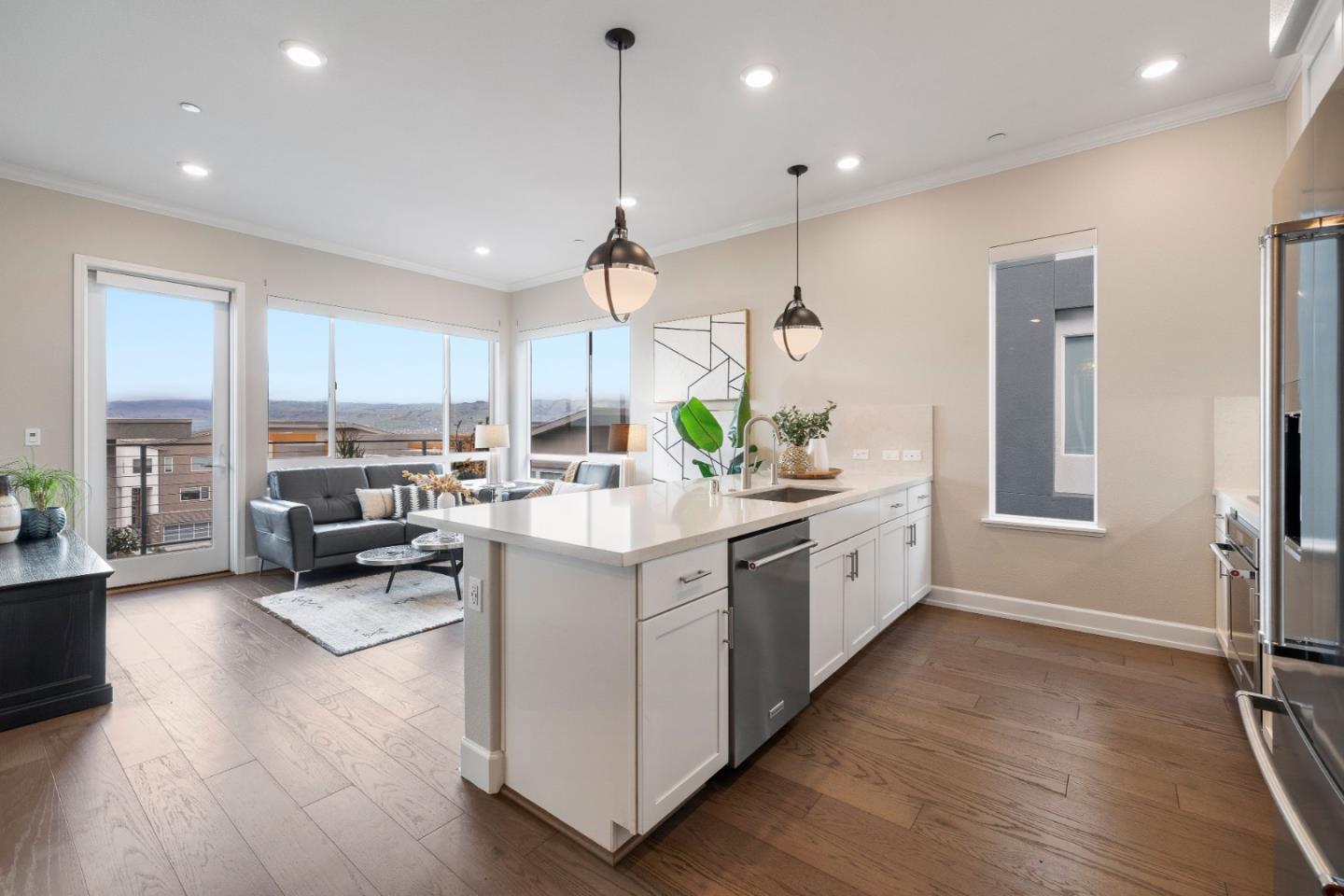 Exceptionally rare and sophisticated, this stylish modern end-unit condominium is nestled in the sought-after Communications Hill community. Boasting one of the largest three-bedroom floor plans available, this property offers captivating views of the mountains and the San Jose skyline from its balcony and expansive open-concept living room. As an end unit, it enjoys the advantage of additional windows, flooding the space with natural light, all effortlessly managed through powered shades. The kitchen is a masterpiece, adorned in pristine white quartz, featuring a large island with a breakfast bar and upgraded high-end matching KitchenAid stainless steel appliances, including a gas cooktop. Additional remarkable features include lofty ceilings, newer LVP flooring throughout, and a Kinetico water system. For an even more expansive and breathtaking experience, venture to the rooftop Sky Terrace, offering additional stunning views, a BBQ area, and lounge chairs. This unit also comes complete with a generously sized garage, comfortably accommodating two cars and pre-wired for an electric vehicle charger. Surrounding the complex, explore scenic walking trails and enjoy Lewis Manly Park. This exquisite property is truly a must-see!