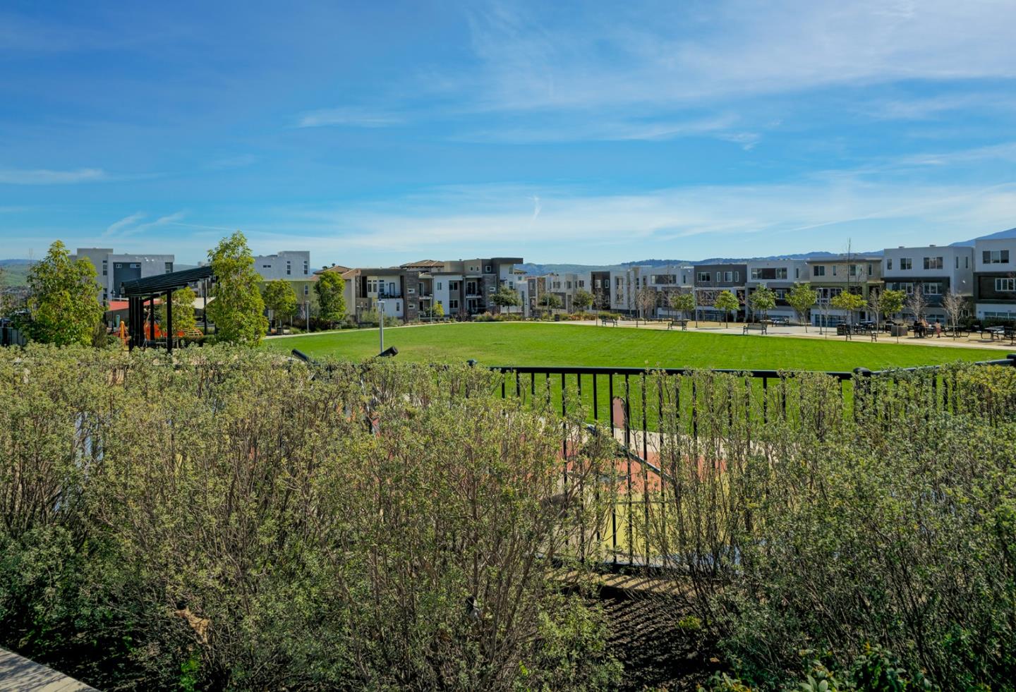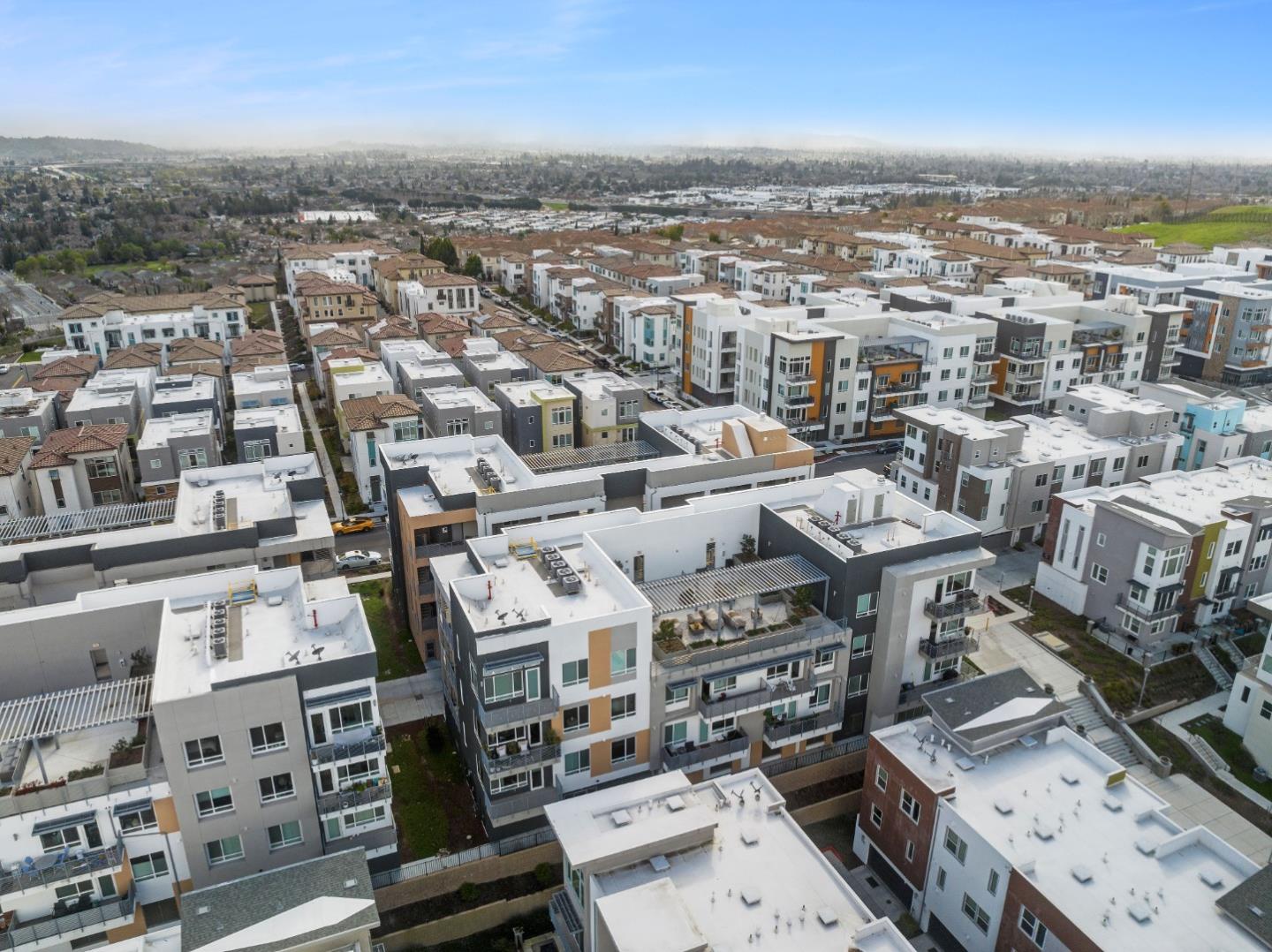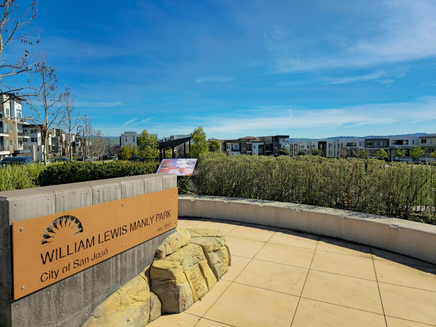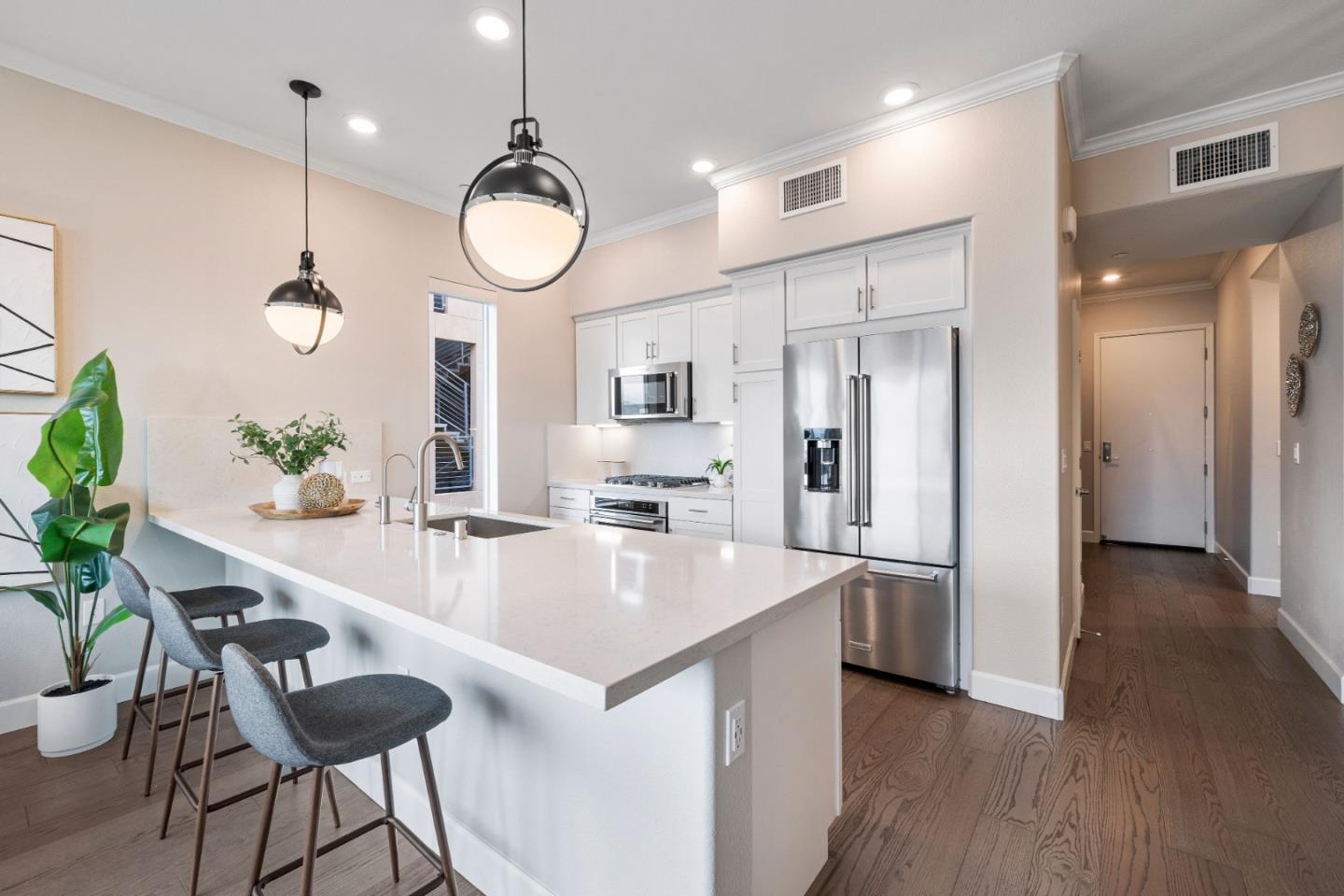 Exceptionally rare and sophisticated, this stylish modern end-unit condominium is nestled in the sought-after Communications Hill community. Boasting one of the largest three-bedroom floor plans available, this property offers captivating views of the mountains and the San Jose skyline from its balcony and expansive open-concept living room. As an end unit, it enjoys the advantage of additional windows, flooding the space with natural light, all effortlessly managed through powered shades. The kitchen is a masterpiece, adorned in pristine white quartz, featuring a large island with a breakfast bar and upgraded high-end matching KitchenAid stainless steel appliances, including a gas cooktop. Additional remarkable features include lofty ceilings, newer LVP flooring throughout, and a Kinetico water system. For an even more expansive and breathtaking experience, venture to the rooftop Sky Terrace, offering additional stunning views, a BBQ area, and lounge chairs. This unit also comes complete with a generously sized garage, comfortably accommodating two cars and pre-wired for an electric vehicle charger. Surrounding the complex, explore scenic walking trails and enjoy Lewis Manly Park. This exquisite property is truly a must-see!