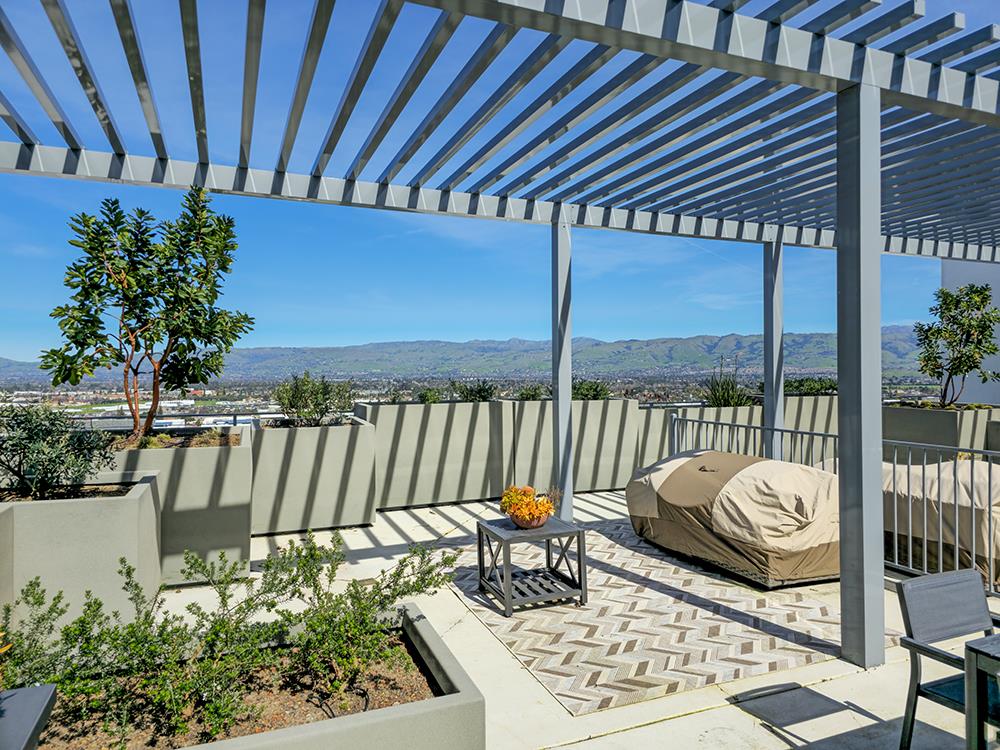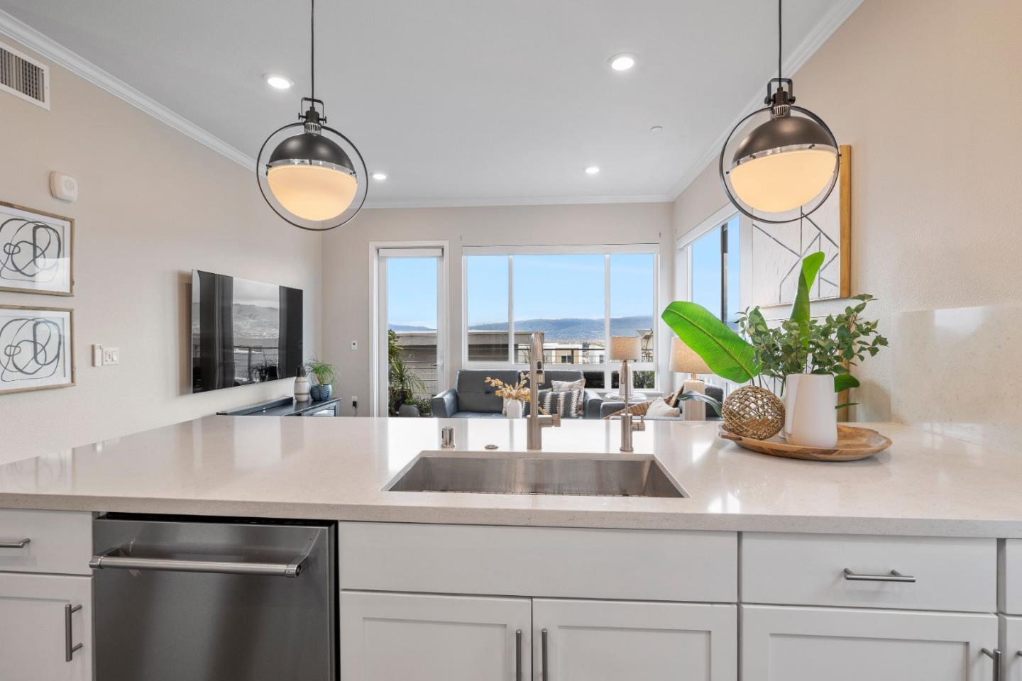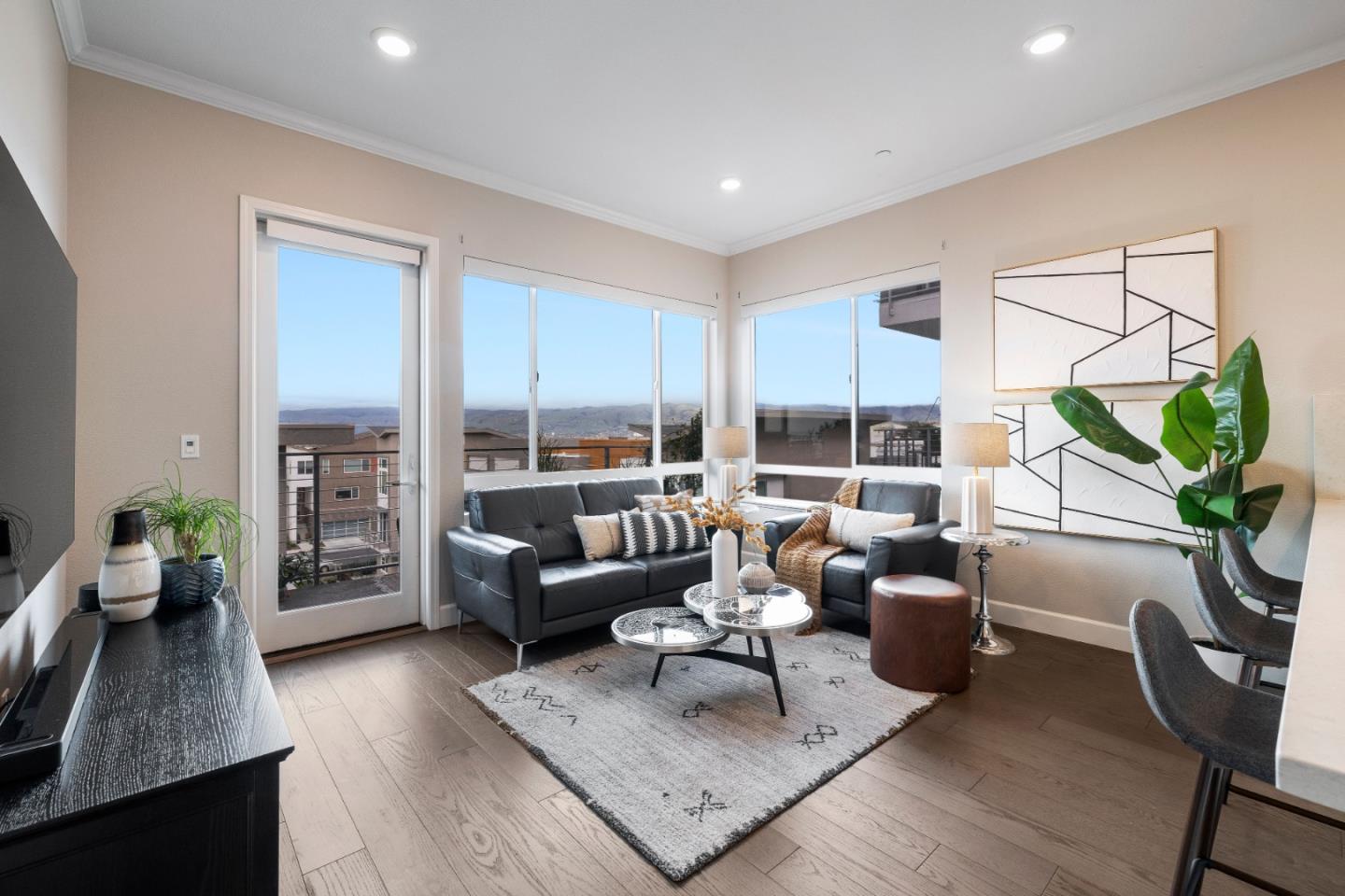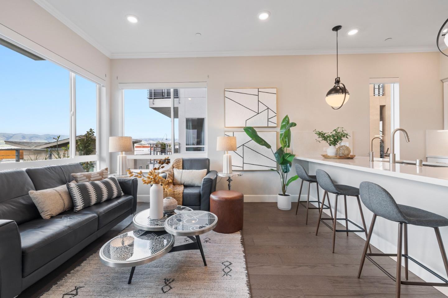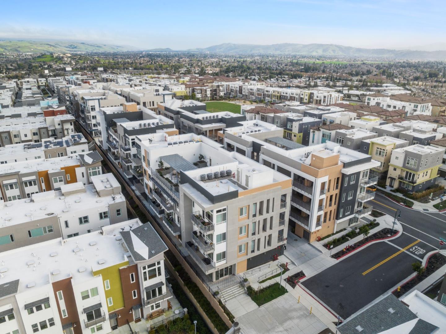 Exceptionally rare and sophisticated, this stylish modern end-unit condominium is nestled in the sought-after Communications Hill community. Boasting one of the largest three-bedroom floor plans available, this property offers captivating views of the mountains and the San Jose skyline from its balcony and expansive open-concept living room. As an end unit, it enjoys the advantage of additional windows, flooding the space with natural light, all effortlessly managed through powered shades. The kitchen is a masterpiece, adorned in pristine white quartz, featuring a large island with a breakfast bar and upgraded high-end matching KitchenAid stainless steel appliances, including a gas cooktop. Additional remarkable features include lofty ceilings, newer LVP flooring throughout, and a Kinetico water system. For an even more expansive and breathtaking experience, venture to the rooftop Sky Terrace, offering additional stunning views, a BBQ area, and lounge chairs. This unit also comes complete with a generously sized garage, comfortably accommodating two cars and pre-wired for an electric vehicle charger. Surrounding the complex, explore scenic walking trails and enjoy Lewis Manly Park. This exquisite property is truly a must-see!