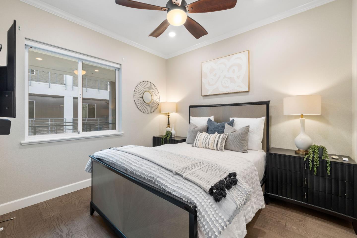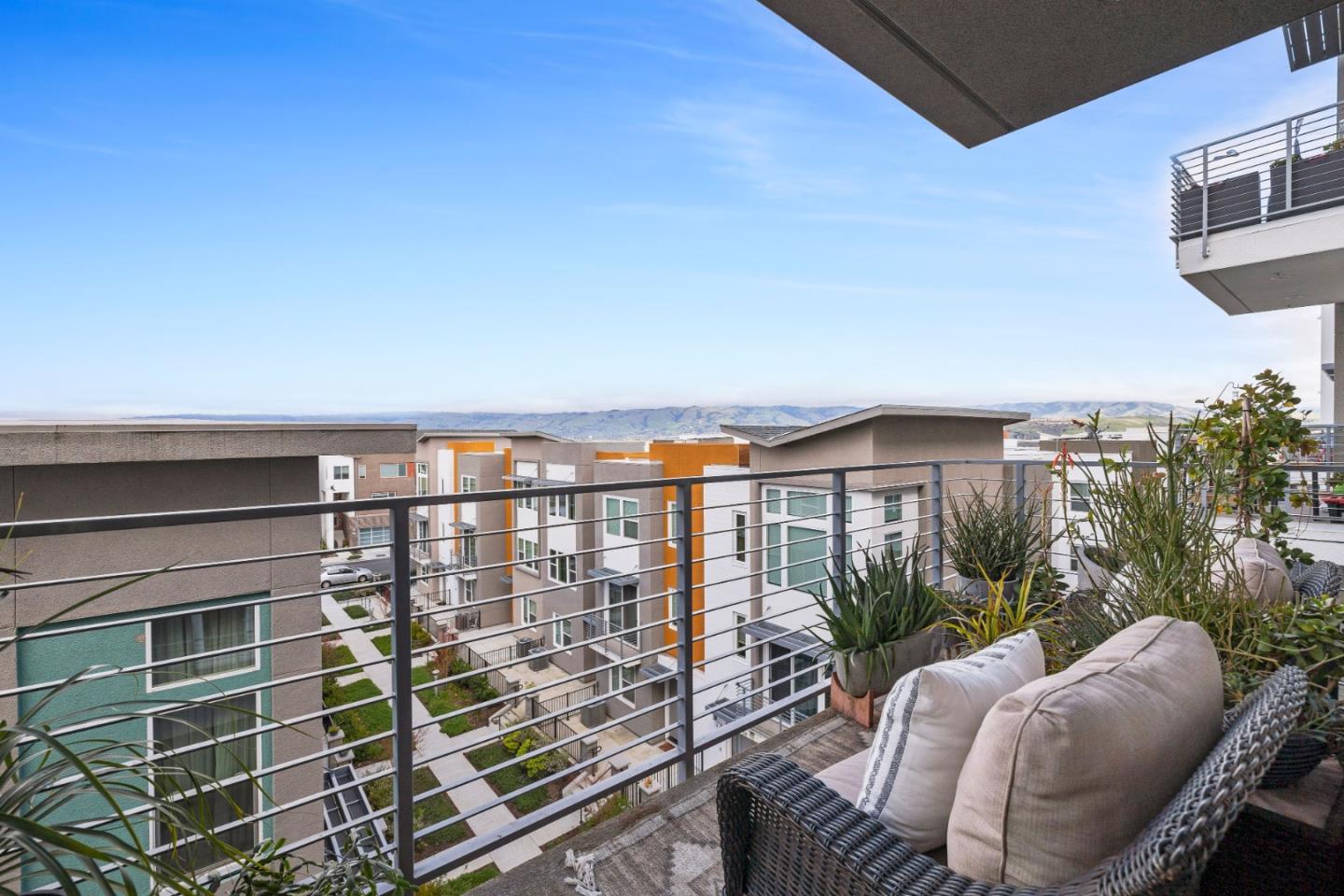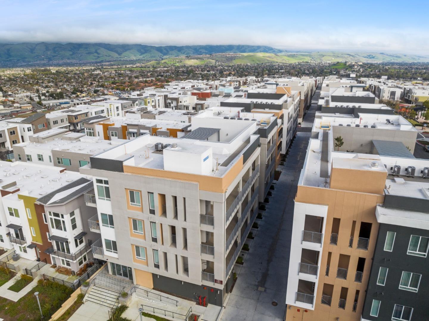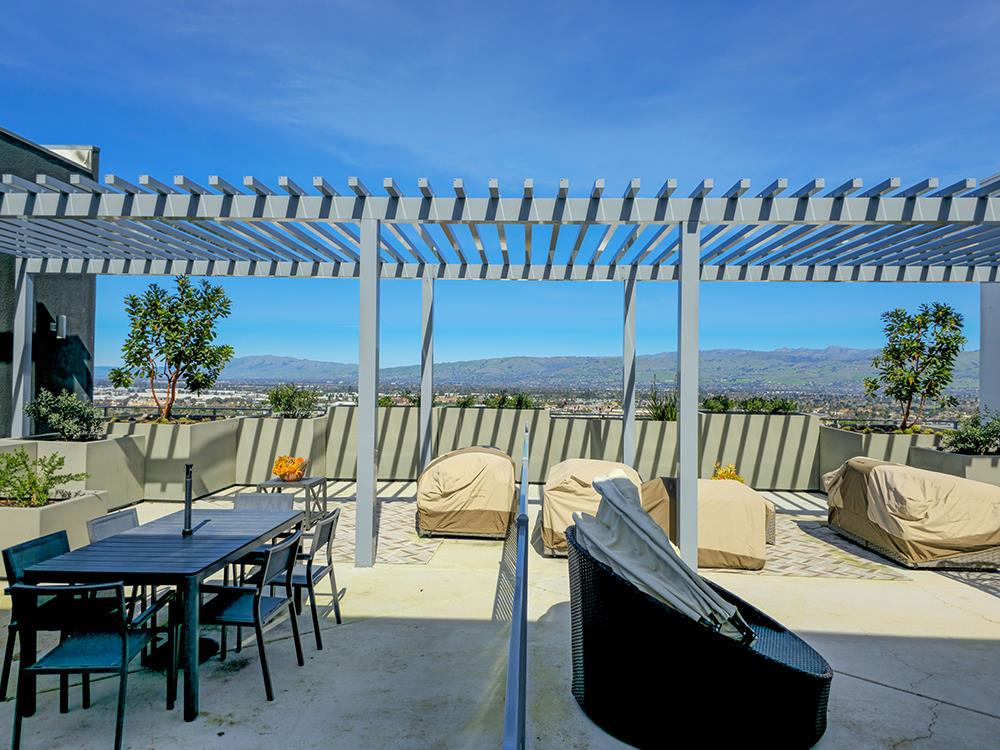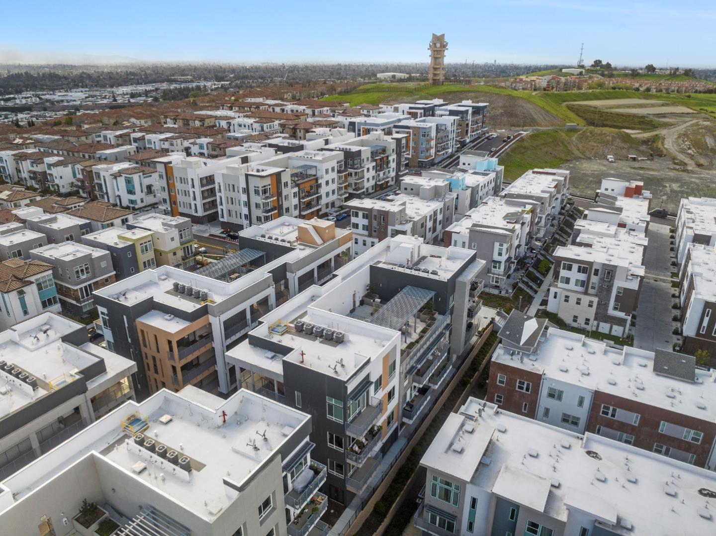 Exceptionally rare and sophisticated, this stylish modern end-unit condominium is nestled in the sought-after Communications Hill community. Boasting one of the largest three-bedroom floor plans available, this property offers captivating views of the mountains and the San Jose skyline from its balcony and expansive open-concept living room. As an end unit, it enjoys the advantage of additional windows, flooding the space with natural light, all effortlessly managed through powered shades. The kitchen is a masterpiece, adorned in pristine white quartz, featuring a large island with a breakfast bar and upgraded high-end matching KitchenAid stainless steel appliances, including a gas cooktop. Additional remarkable features include lofty ceilings, newer LVP flooring throughout, and a Kinetico water system. For an even more expansive and breathtaking experience, venture to the rooftop Sky Terrace, offering additional stunning views, a BBQ area, and lounge chairs. This unit also comes complete with a generously sized garage, comfortably accommodating two cars and pre-wired for an electric vehicle charger. Surrounding the complex, explore scenic walking trails and enjoy Lewis Manly Park. This exquisite property is truly a must-see!