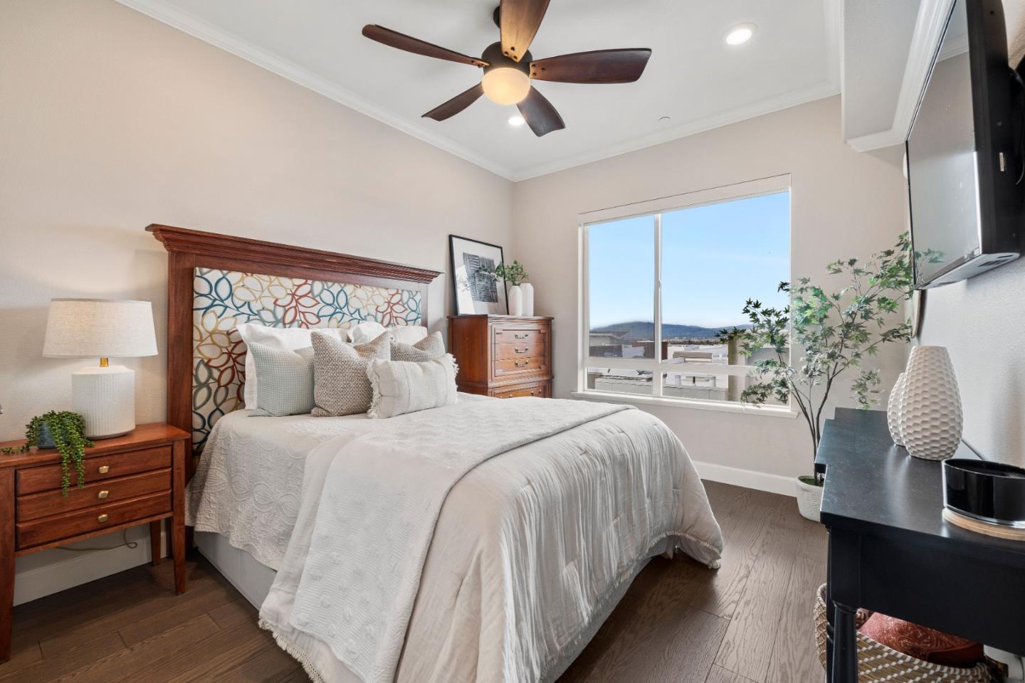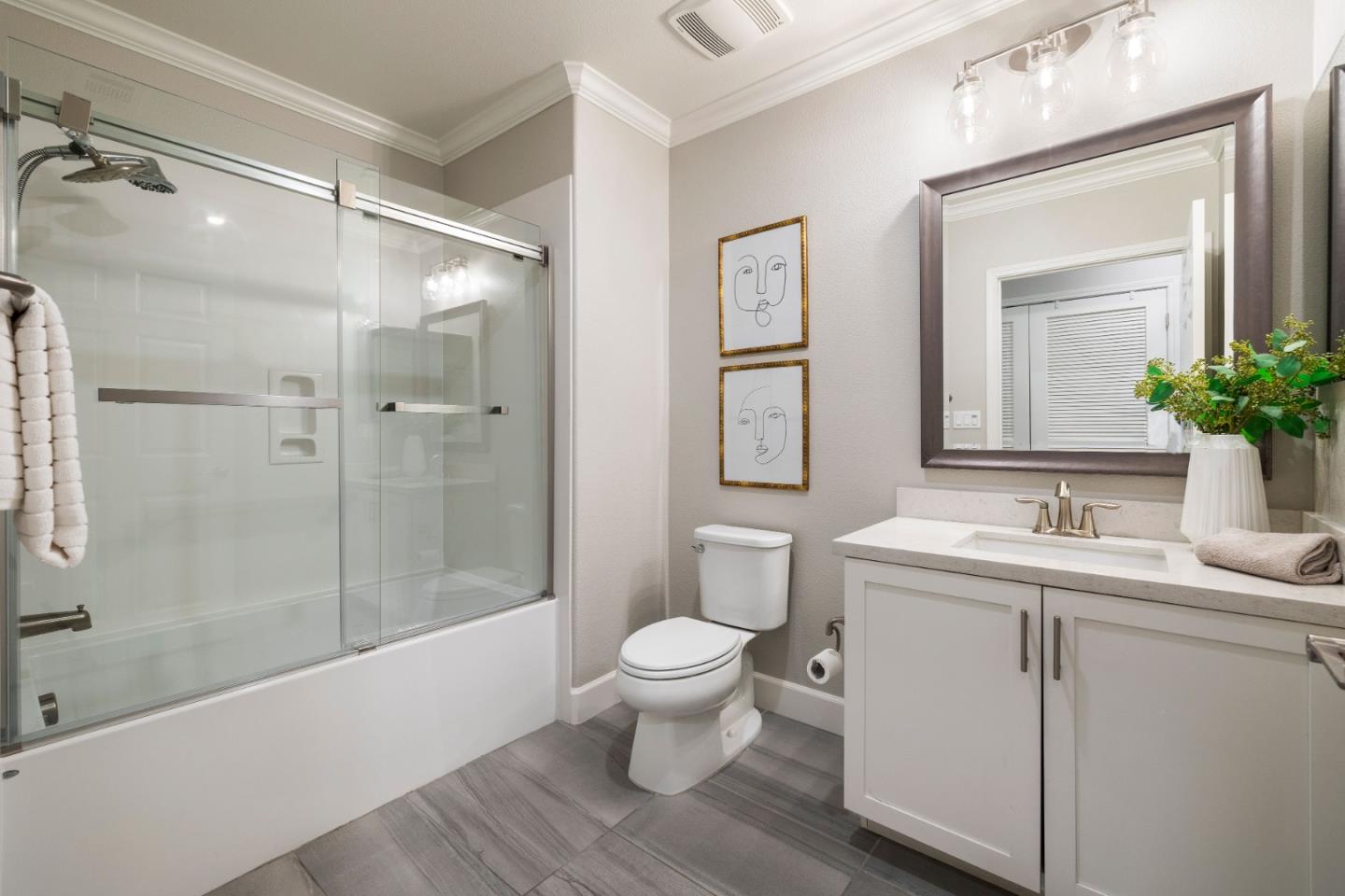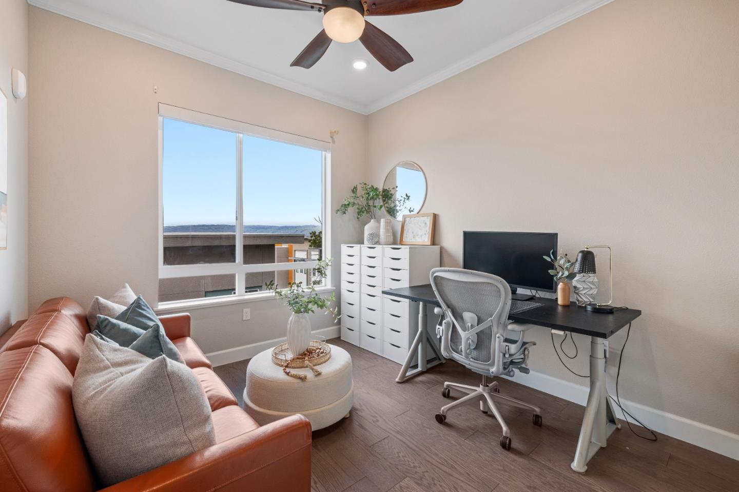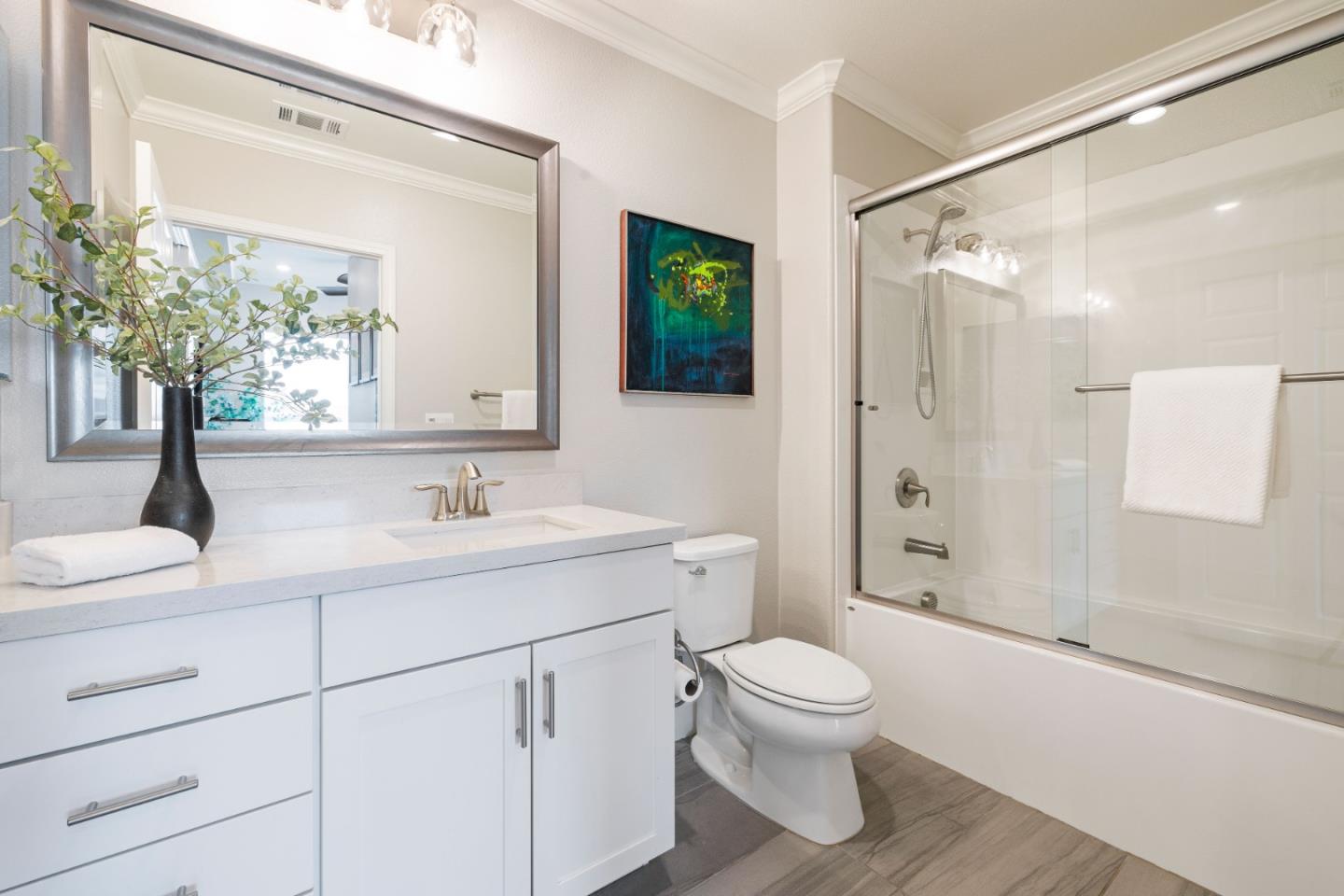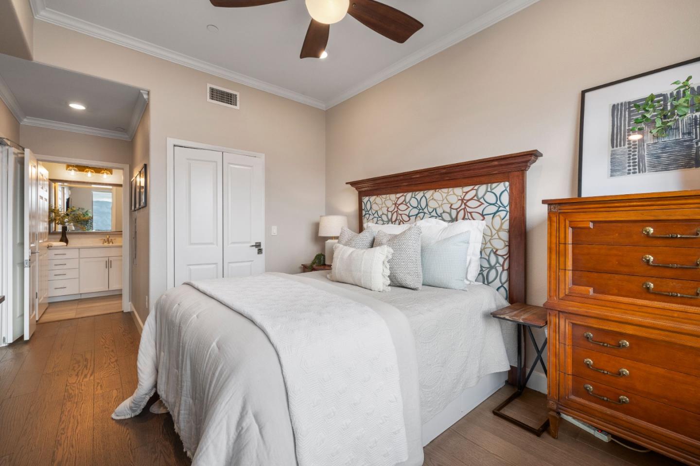 Exceptionally rare and sophisticated, this stylish modern end-unit condominium is nestled in the sought-after Communications Hill community. Boasting one of the largest three-bedroom floor plans available, this property offers captivating views of the mountains and the San Jose skyline from its balcony and expansive open-concept living room. As an end unit, it enjoys the advantage of additional windows, flooding the space with natural light, all effortlessly managed through powered shades. The kitchen is a masterpiece, adorned in pristine white quartz, featuring a large island with a breakfast bar and upgraded high-end matching KitchenAid stainless steel appliances, including a gas cooktop. Additional remarkable features include lofty ceilings, newer LVP flooring throughout, and a Kinetico water system. For an even more expansive and breathtaking experience, venture to the rooftop Sky Terrace, offering additional stunning views, a BBQ area, and lounge chairs. This unit also comes complete with a generously sized garage, comfortably accommodating two cars and pre-wired for an electric vehicle charger. Surrounding the complex, explore scenic walking trails and enjoy Lewis Manly Park. This exquisite property is truly a must-see!