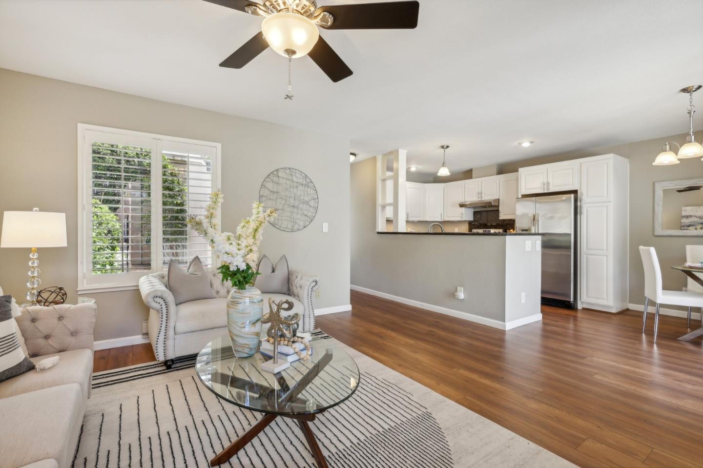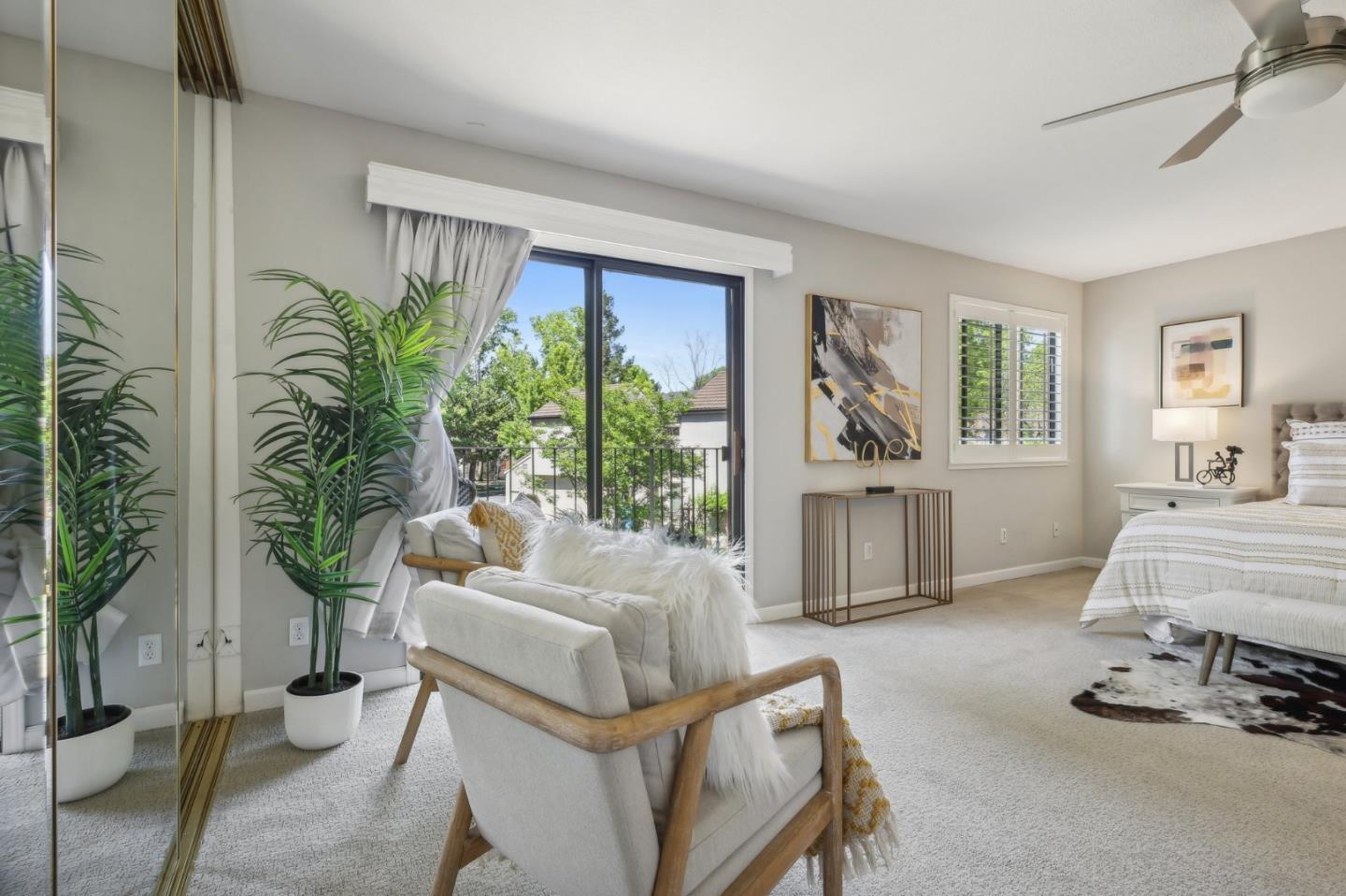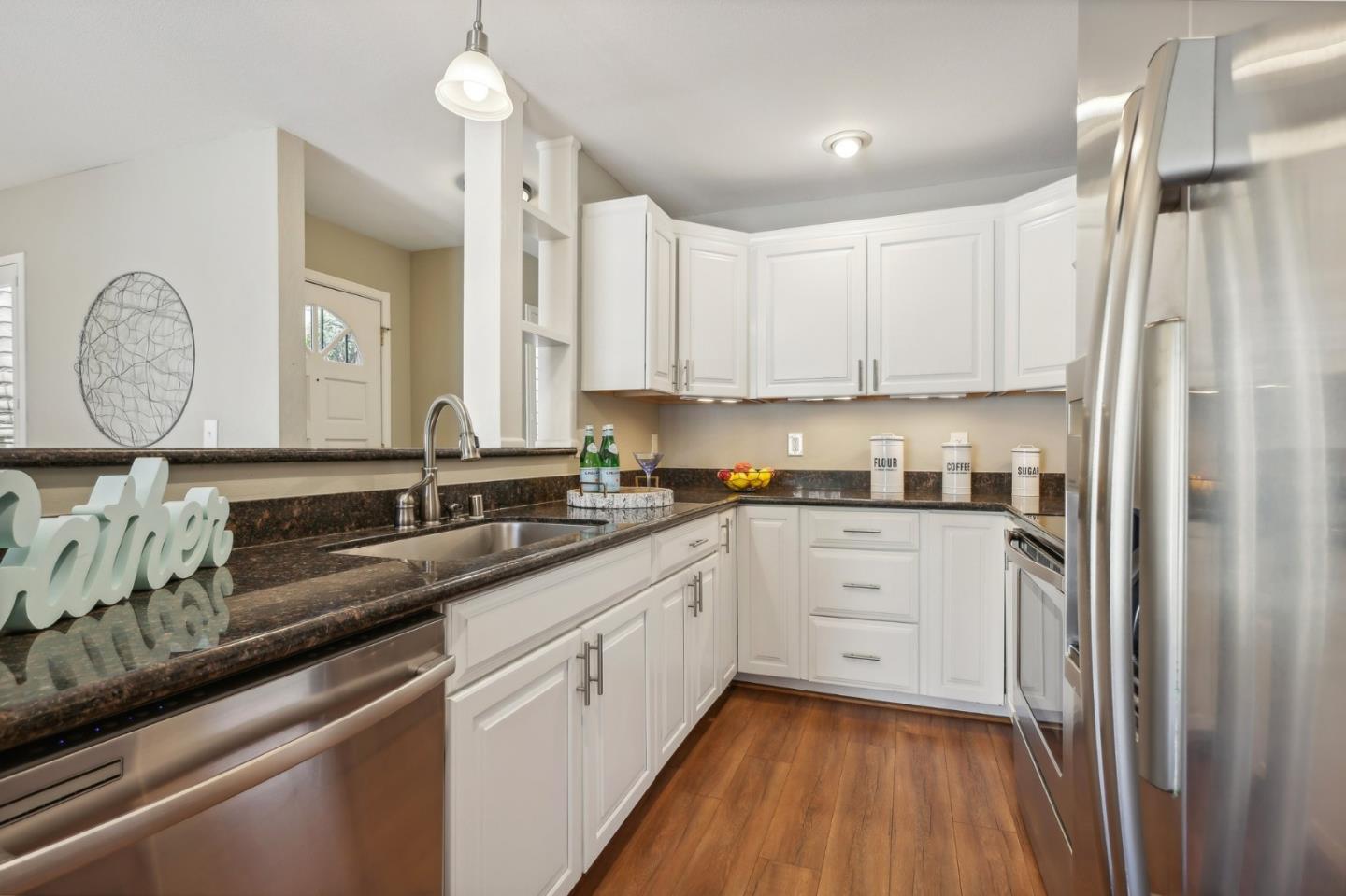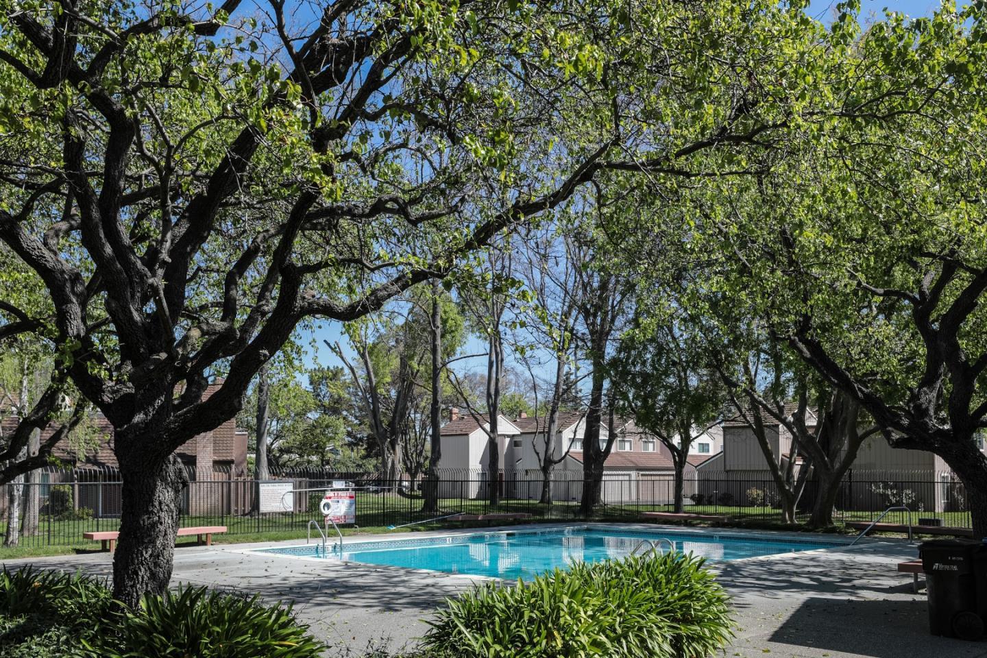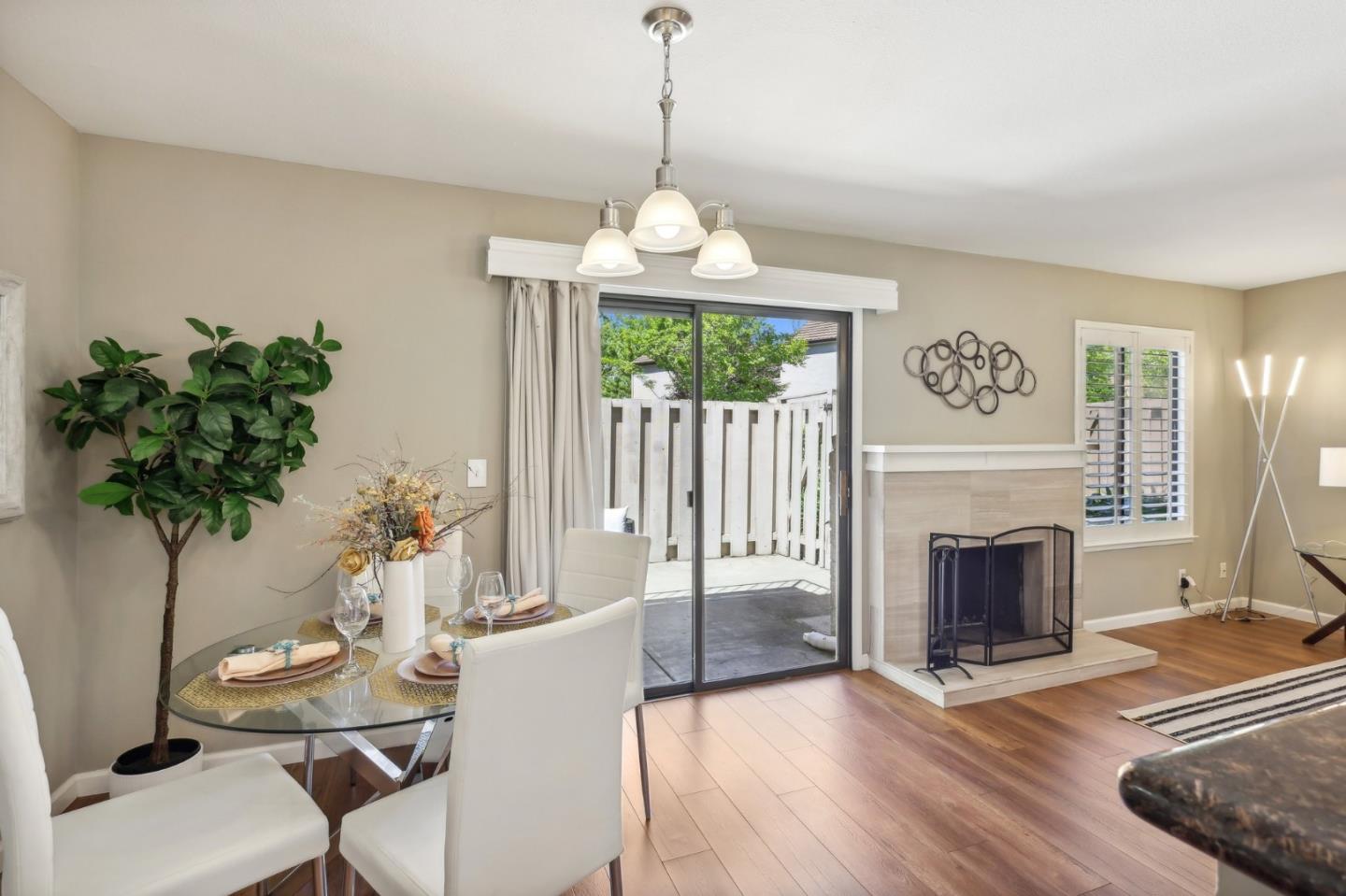 Nestled in the sought-after South Park community in the heart of Silicon Valley, this stunning townhome exudes contemporary elegance and offers an abundance of natural light and serene views of lush greenery. The open-concept floor plan has been thoughtfully remodeled to provide unparalleled privacy and modern design. Upon entry, the state-of-the-art living room welcomes you with high-end flooring, a cozy wood-burning fireplace, and expansive windows that bathe the space in sunlight. The gourmet kitchen is a chef's dream, featuring sleek solid granite slab counters, custom cabinetry, and top-of-the-line stainless steel appliances. The bathroom has been tastefully updated with separate shower and tub, as well as separate vanities, creating a tranquil retreat. Notable features include plantation shutters, recessed lighting, attached two-car garage, a private balcony, and two private yards. This home offers both comfort and convenience, with its proximity to the family-friendly Bracher Parks, Levi's Stadium, ST Creek Trail, schools and stores. Furthermore, its close proximity to major tech companies and easy access to freeways ensures seamless connectivity for residents. Experience the perfect blend of luxury living and modern amenities in this exceptional Silicon Valley residence.