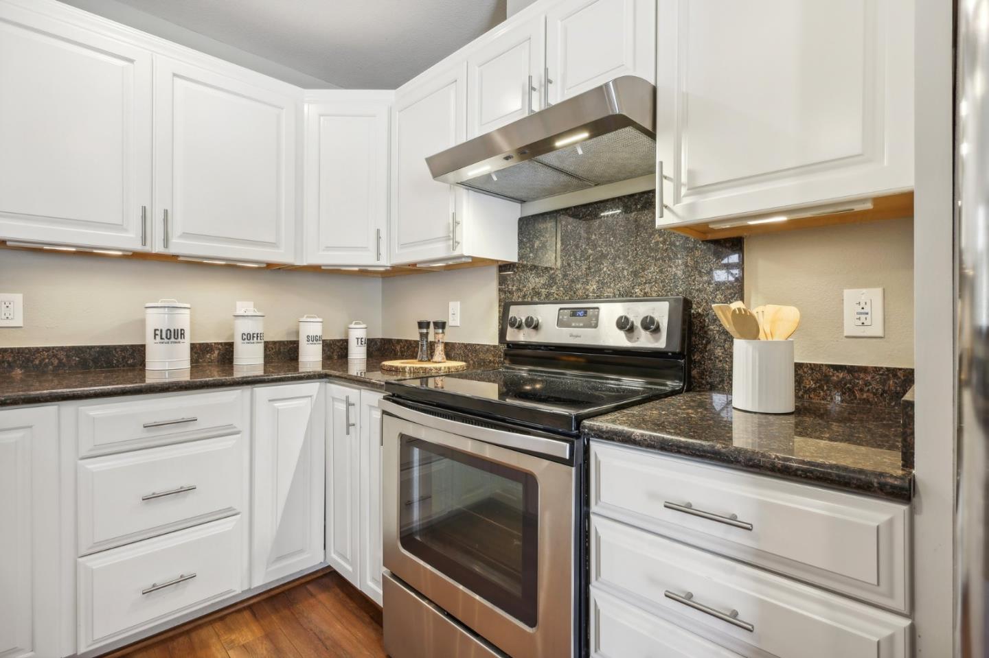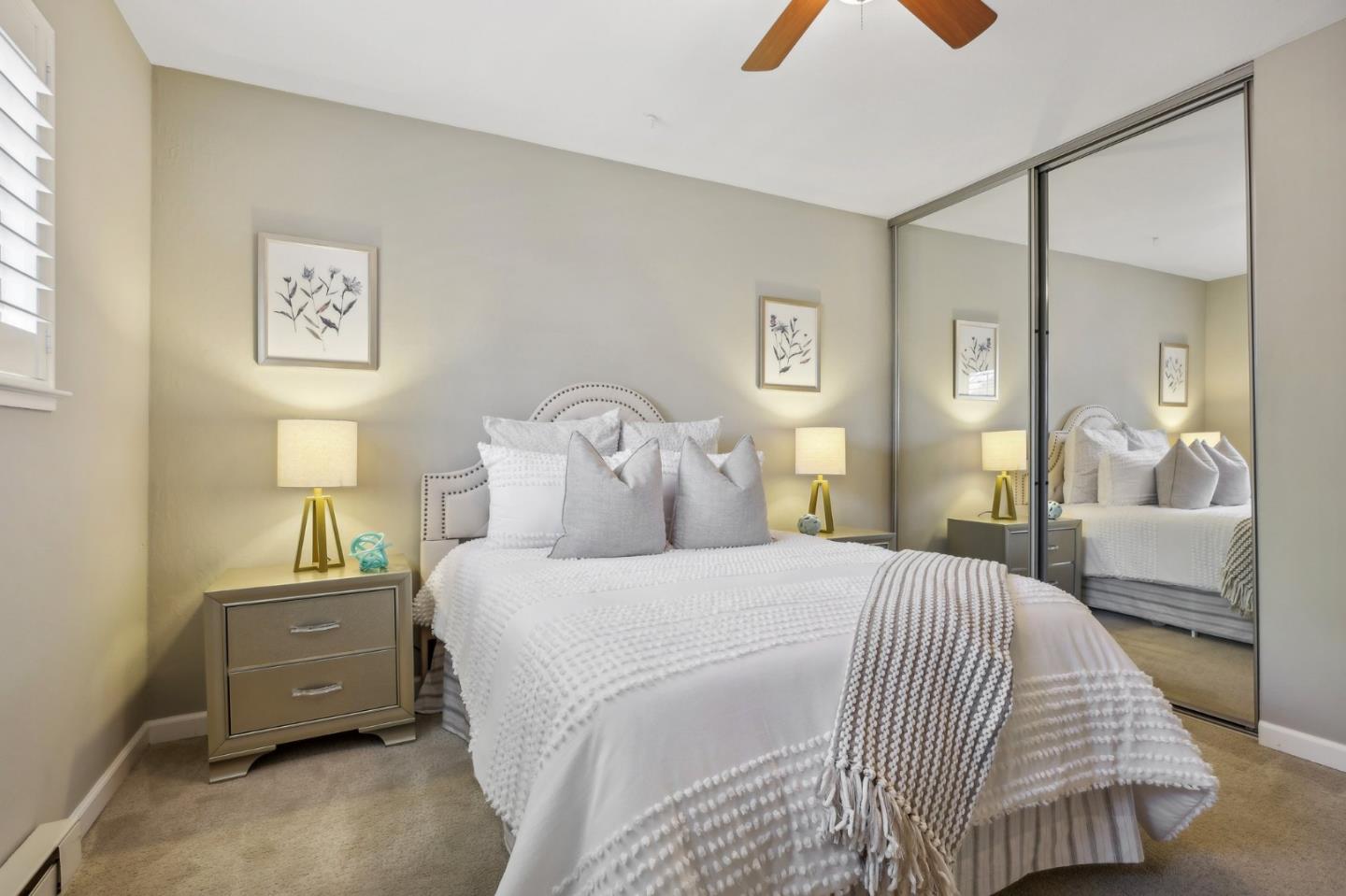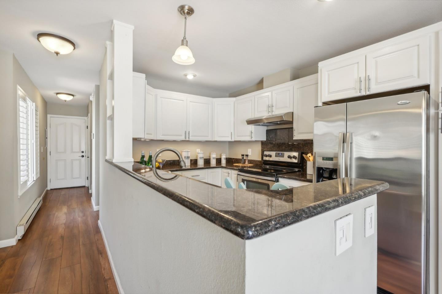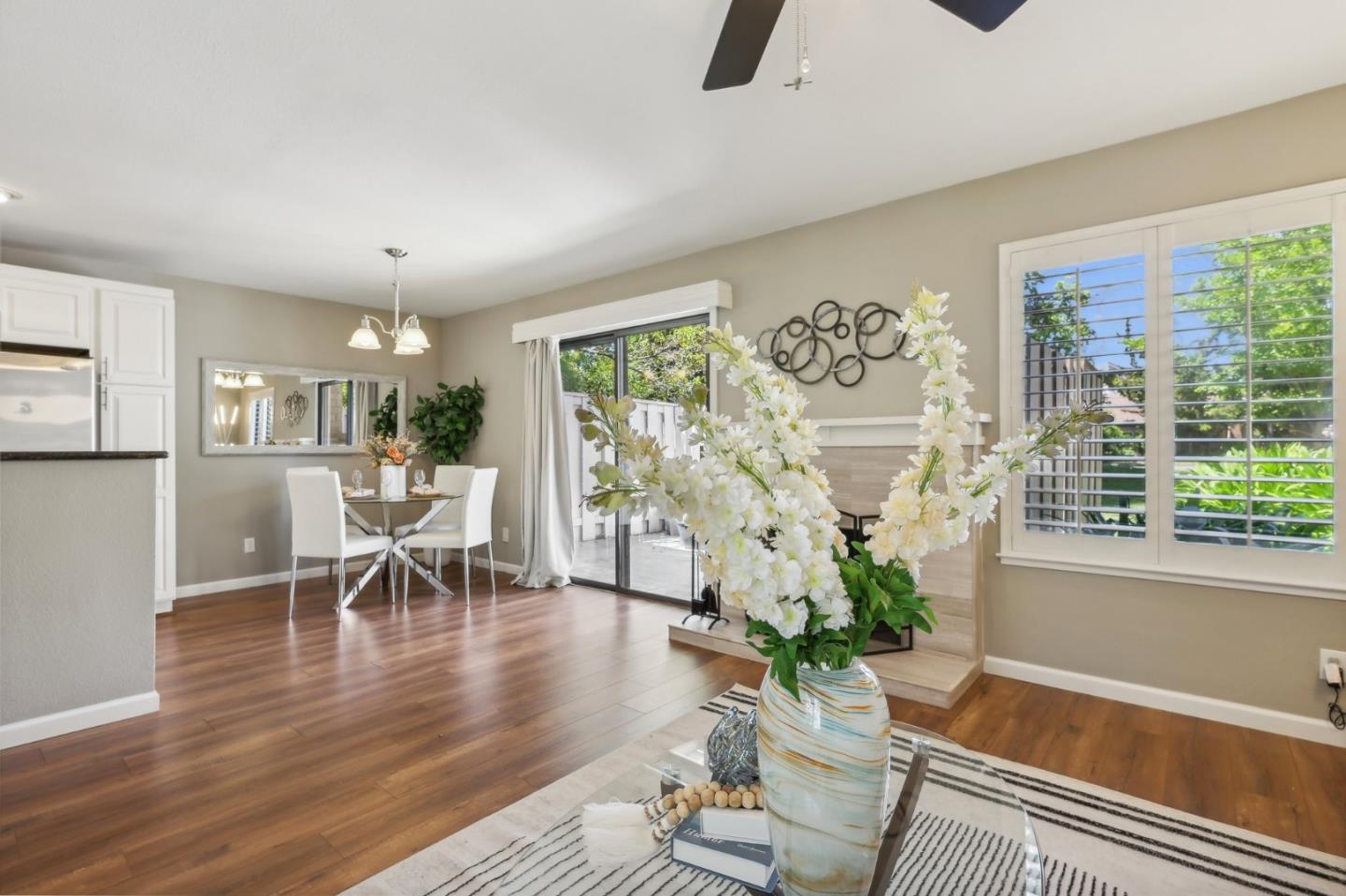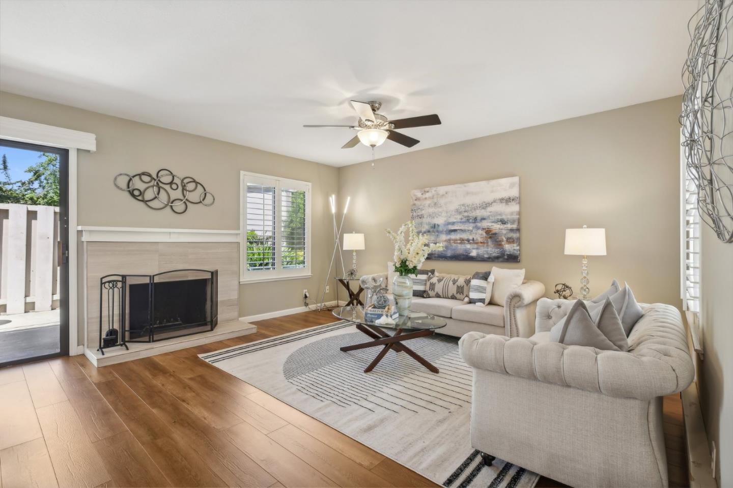 Nestled in the sought-after South Park community in the heart of Silicon Valley, this stunning townhome exudes contemporary elegance and offers an abundance of natural light and serene views of lush greenery. The open-concept floor plan has been thoughtfully remodeled to provide unparalleled privacy and modern design. Upon entry, the state-of-the-art living room welcomes you with high-end flooring, a cozy wood-burning fireplace, and expansive windows that bathe the space in sunlight. The gourmet kitchen is a chef's dream, featuring sleek solid granite slab counters, custom cabinetry, and top-of-the-line stainless steel appliances. The bathroom has been tastefully updated with separate shower and tub, as well as separate vanities, creating a tranquil retreat. Notable features include plantation shutters, recessed lighting, attached two-car garage, a private balcony, and two private yards. This home offers both comfort and convenience, with its proximity to the family-friendly Bracher Parks, Levi's Stadium, ST Creek Trail, schools and stores. Furthermore, its close proximity to major tech companies and easy access to freeways ensures seamless connectivity for residents. Experience the perfect blend of luxury living and modern amenities in this exceptional Silicon Valley residence.