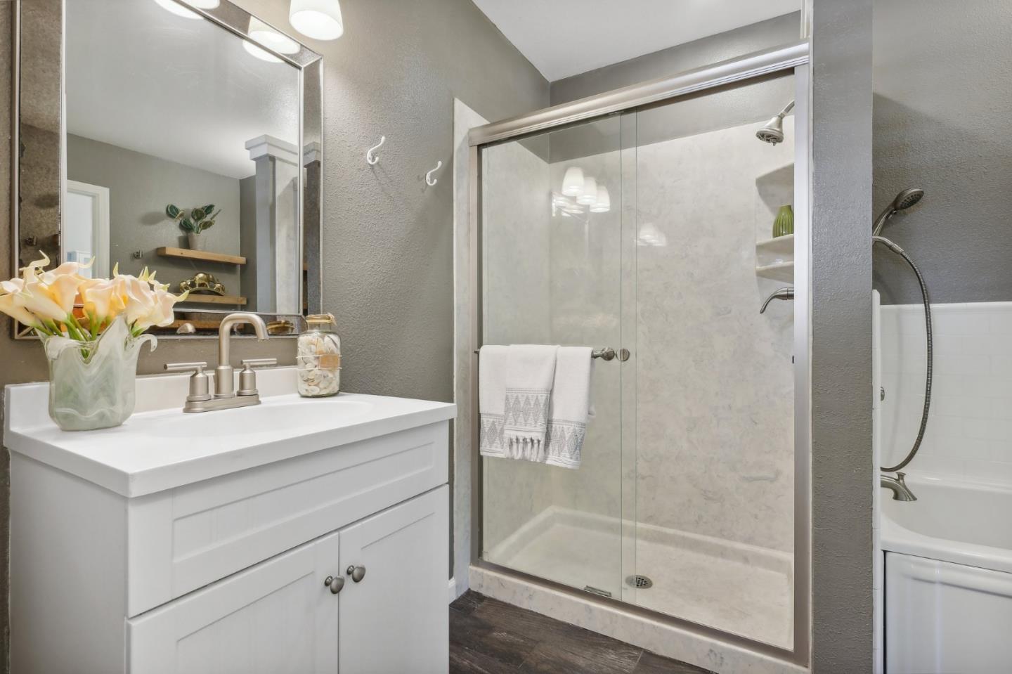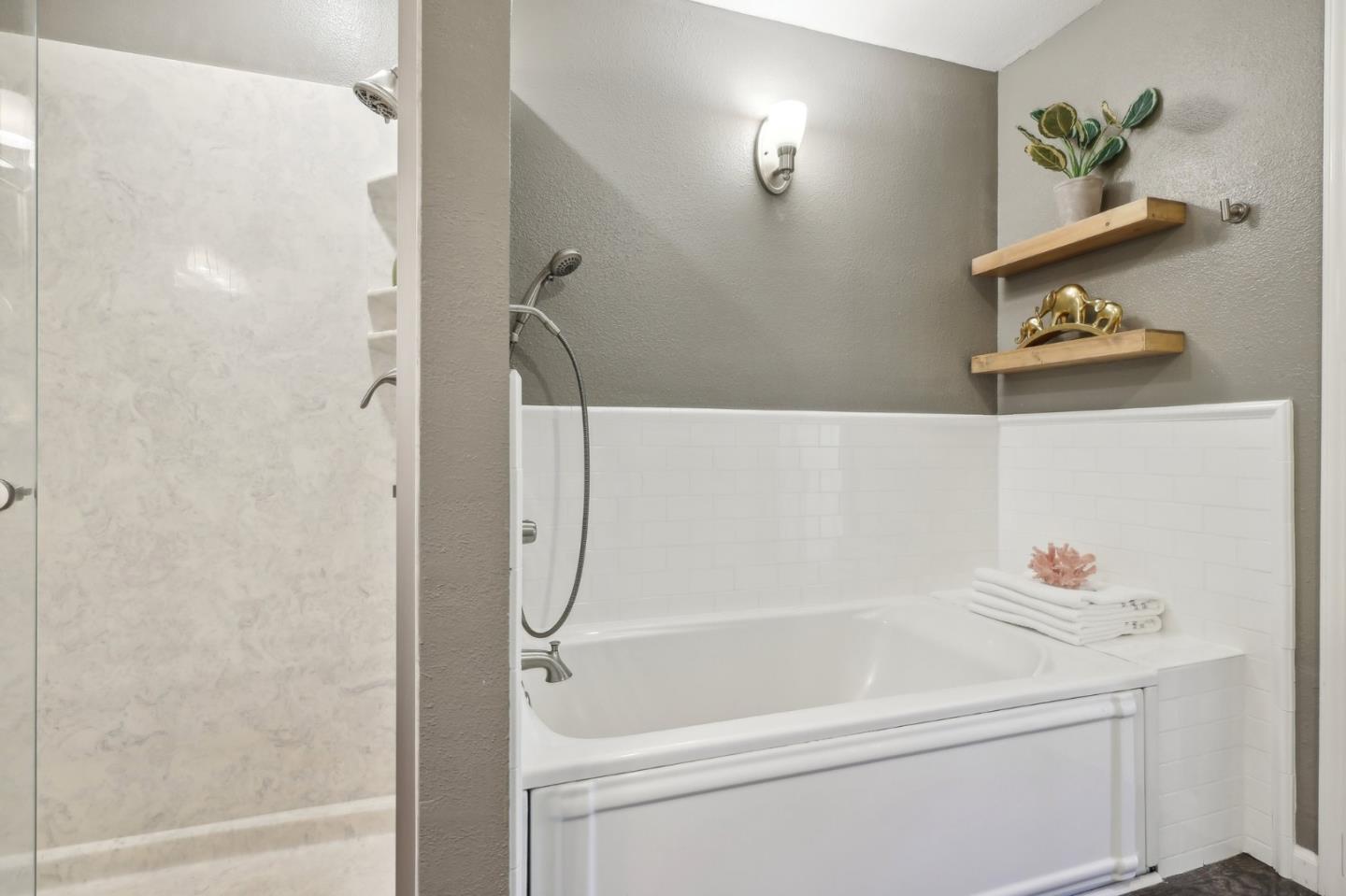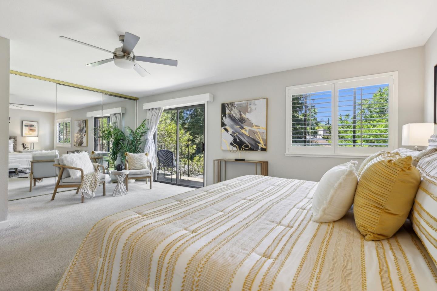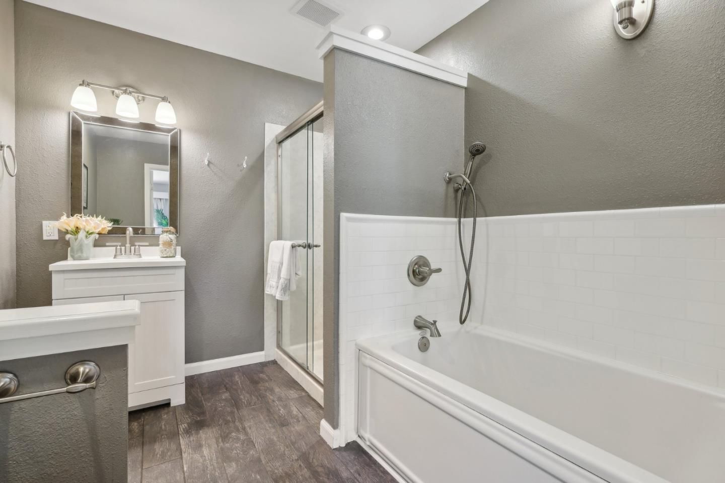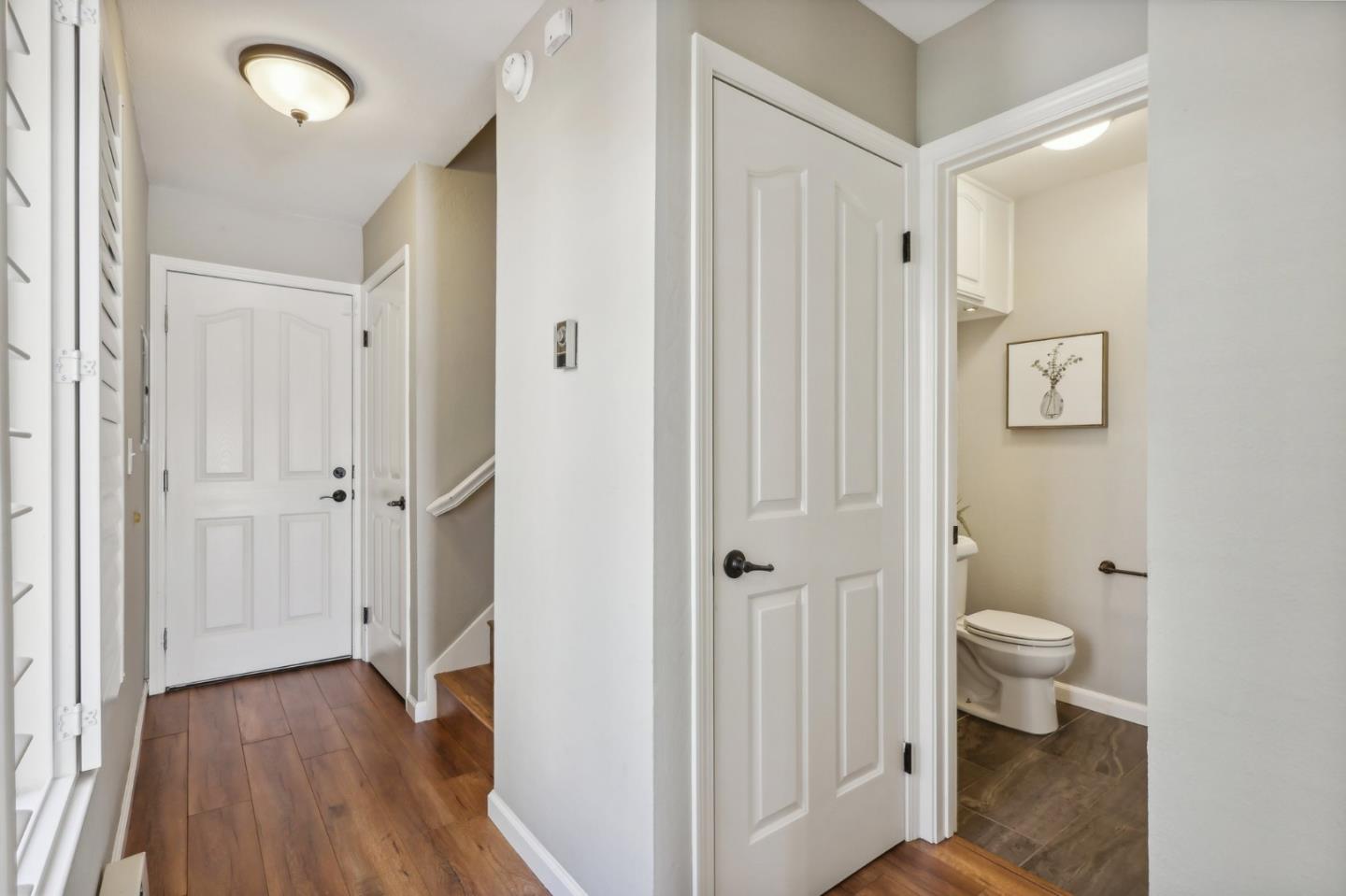 Nestled in the sought-after South Park community in the heart of Silicon Valley, this stunning townhome exudes contemporary elegance and offers an abundance of natural light and serene views of lush greenery. The open-concept floor plan has been thoughtfully remodeled to provide unparalleled privacy and modern design. Upon entry, the state-of-the-art living room welcomes you with high-end flooring, a cozy wood-burning fireplace, and expansive windows that bathe the space in sunlight. The gourmet kitchen is a chef's dream, featuring sleek solid granite slab counters, custom cabinetry, and top-of-the-line stainless steel appliances. The bathroom has been tastefully updated with separate shower and tub, as well as separate vanities, creating a tranquil retreat. Notable features include plantation shutters, recessed lighting, attached two-car garage, a private balcony, and two private yards. This home offers both comfort and convenience, with its proximity to the family-friendly Bracher Parks, Levi's Stadium, ST Creek Trail, schools and stores. Furthermore, its close proximity to major tech companies and easy access to freeways ensures seamless connectivity for residents. Experience the perfect blend of luxury living and modern amenities in this exceptional Silicon Valley residence.